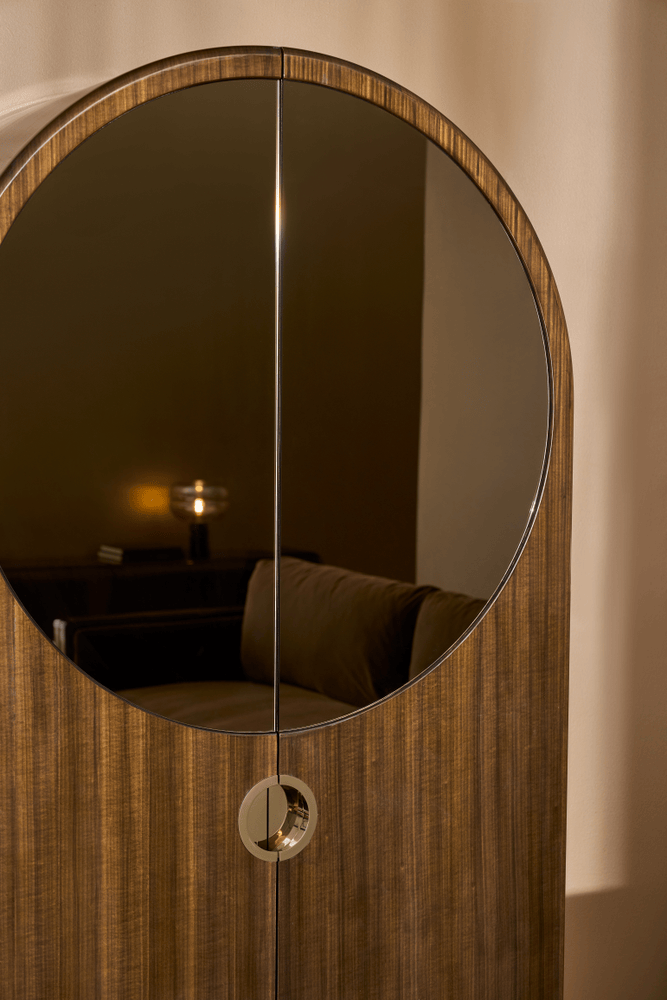 This stately armoire is the epitome of post-modern Italian aesthetics. At home in a living room, study or bedroom, its arched form is dressed in an impressive high-gloss finish. Two doors are graced with a large, circular mirror. A round, inset split-pull in Whisper of Gold opens the doors to reveal the piece’s multi-functional versatility with one adjustable shelf, a touch-latch pull-out writing surface and four drawers with pull-tab guides in Whisper of Gold. A plinth base with delicate corner flourishes is finished in hand-applied shimmering Oracle leaf.