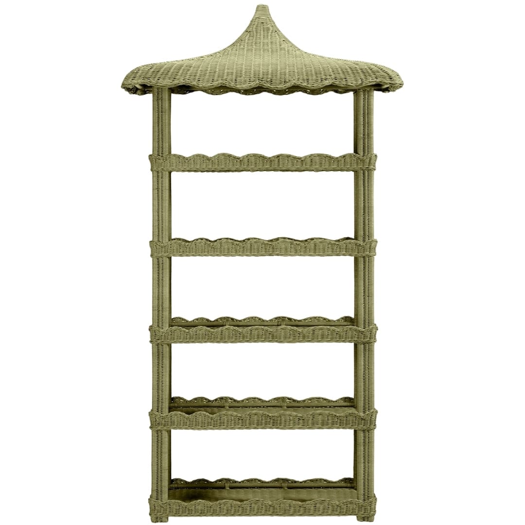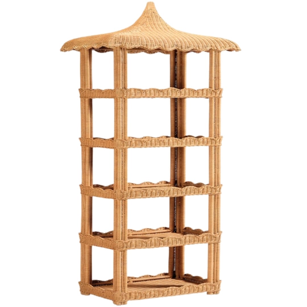 The Georgina bookcase boasts a simple silhouette with lightly scalloped edges on each shelf and an intricately crafted roof, perfect for bath essentials and curated displays.