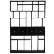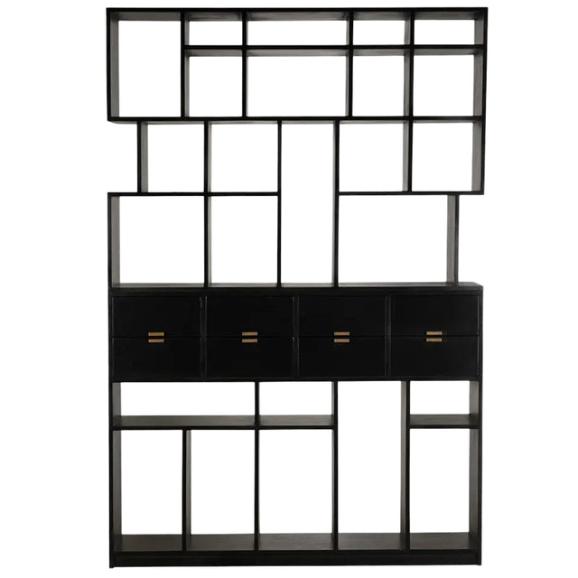 A modern, Hand-Rubbed Black bookcase with eight drawers, brass pulls, and asymmetrical open shelving. Its geometric design balances visual rhythm and function, serving as a sculptural room divider or display piece.