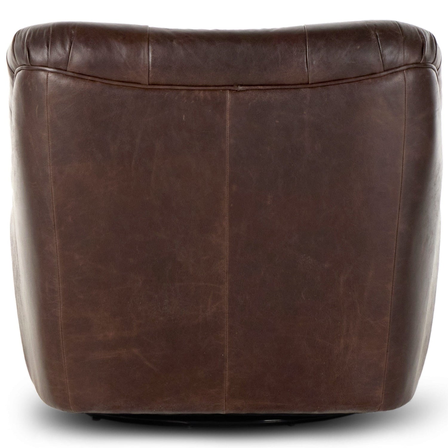 Modern meets vintage on a 360-degree swivel. Designed with comfort in mind, this armless seating style is upholstered in a vintage-like top-grain leather with lustrous highs and lows. Blind tufting and subtly flared sides offer a true "sink-in" seating experience, while a 360-degree swivel adds modernity.