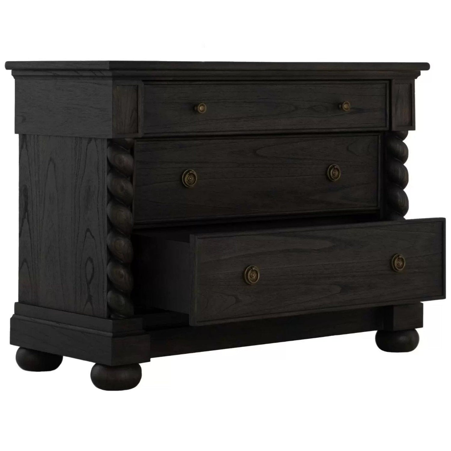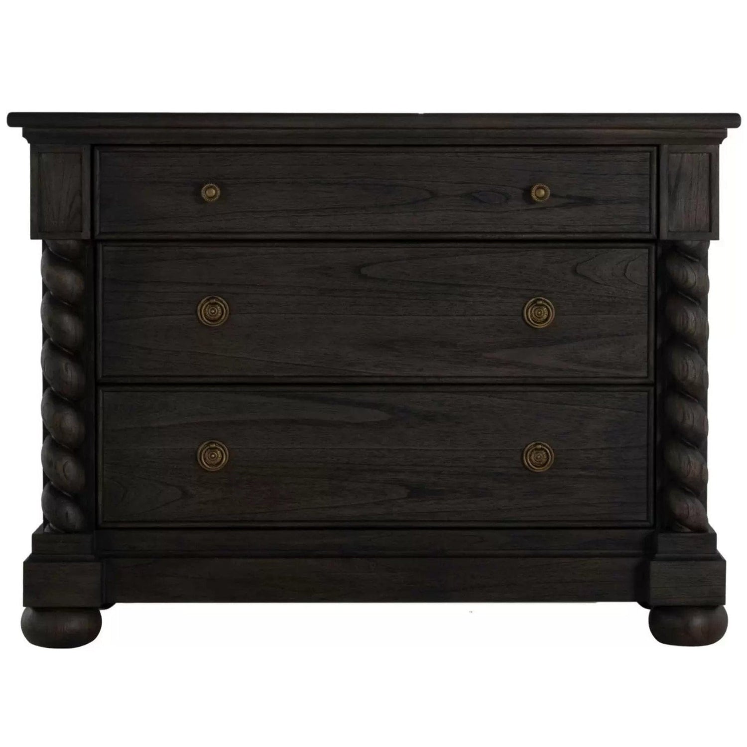 The Burkhardt Chest is a bold statement piece embodying traditional design elements with a grand presence Featuring ample storage through its uniquely sized drawers this chest combines functionality with intricate barley twist columns and layered trim detailing Crafted from durable mindi wood the Burkhardt Chest comes in two stunning finishes a brushed black finish with dark antique brass hardware and a dark stained oak finish complemented by dark antique bronze accents Perfect for those who appreciate a balance of classic style with practical storage the Burkhardt Chest adds both elegance and utility to any space