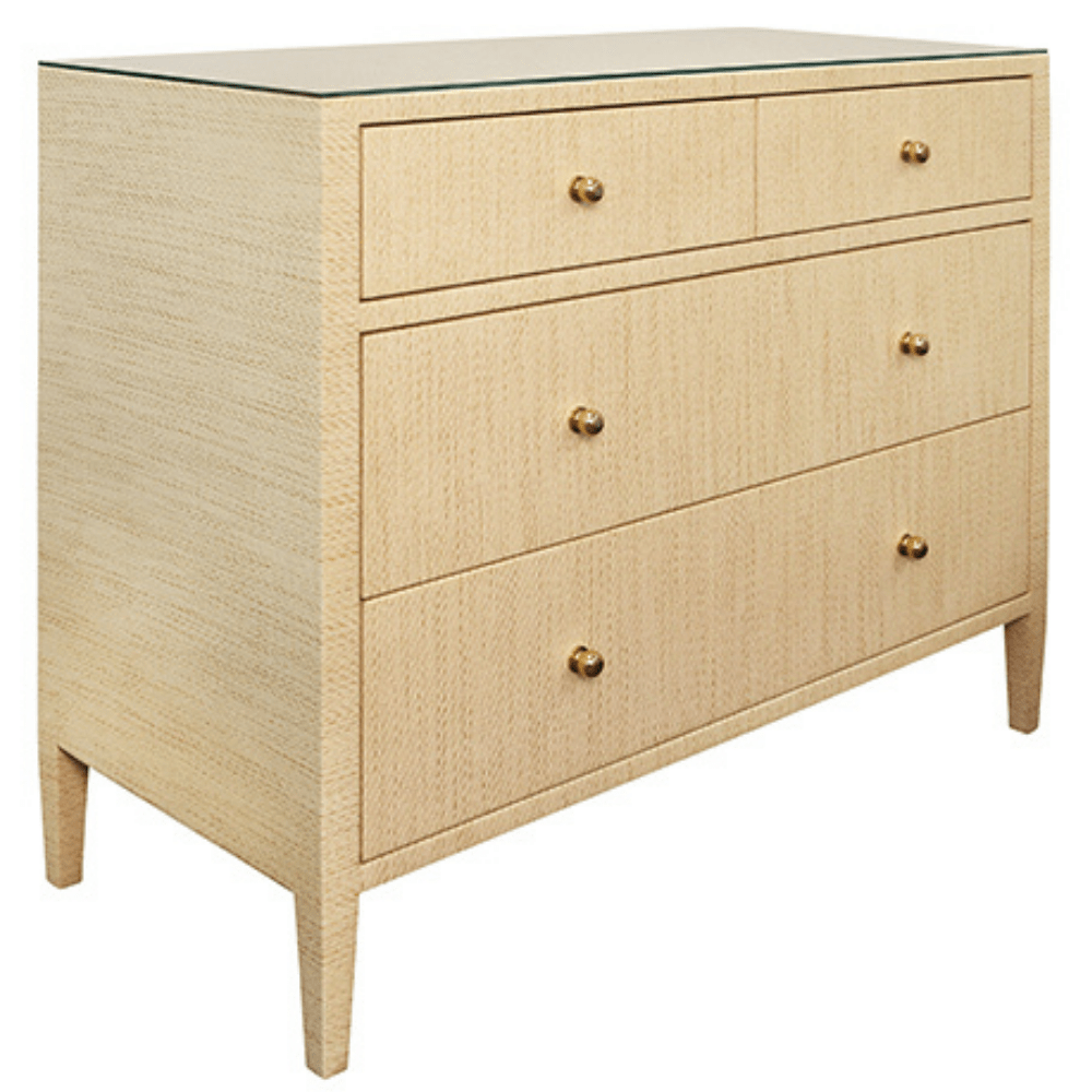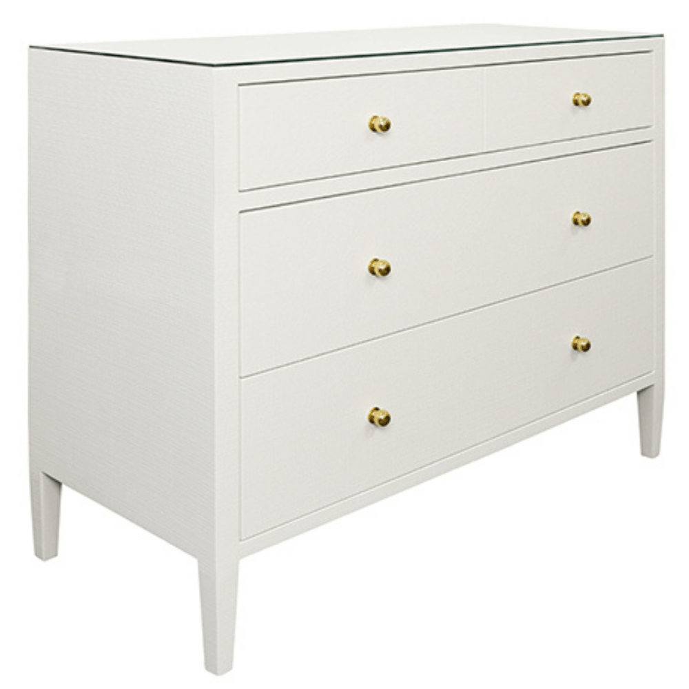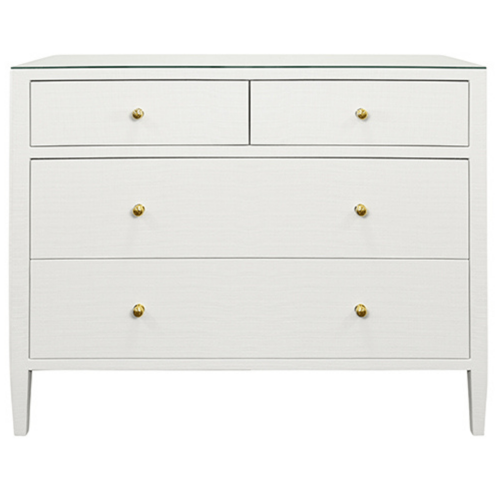 The Michelle Chest blends classic elegance with contemporary refinement and topped with a sleek glass surface. Its clean-lined silhouette features spacious drawers accented with minimalist metal hardware, offering a sophisticated yet functional storage solution for any bedroom or living space. The subtle textural details of the linen complement the smooth glass top, striking the perfect balance between comfort and modern style.