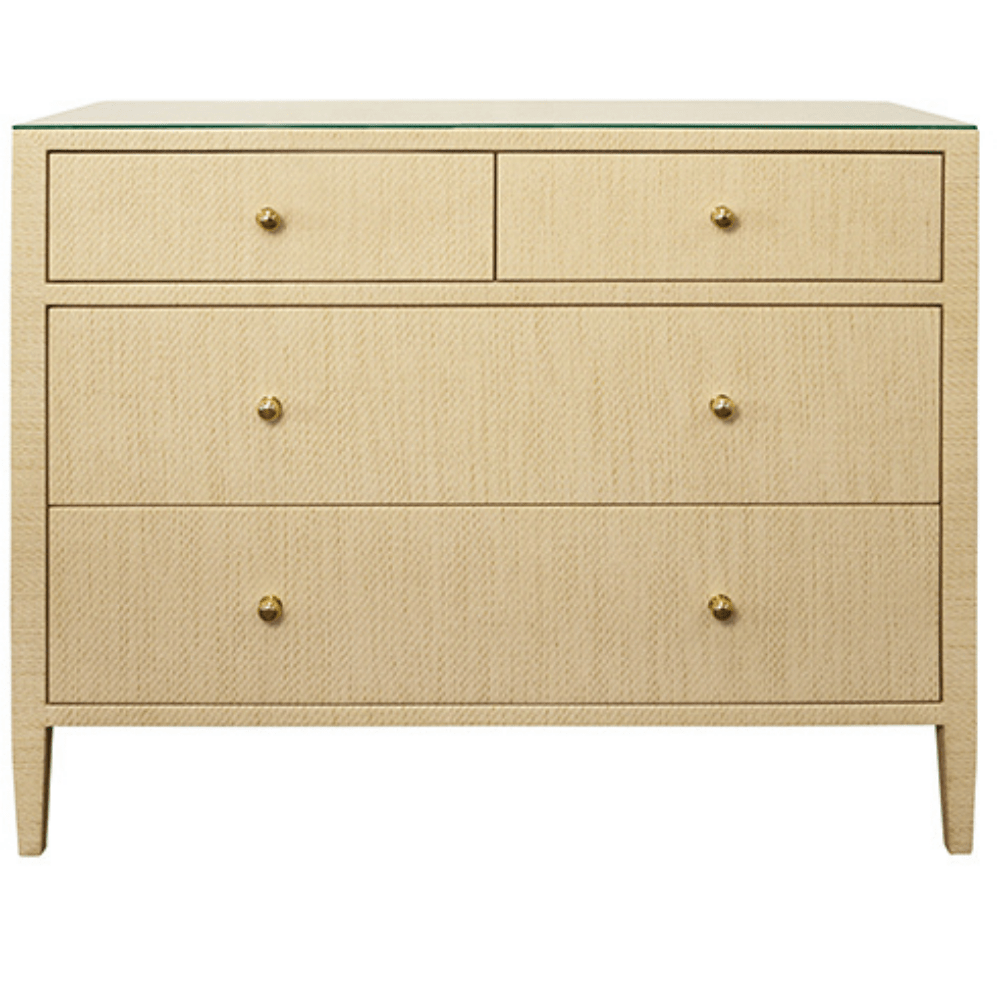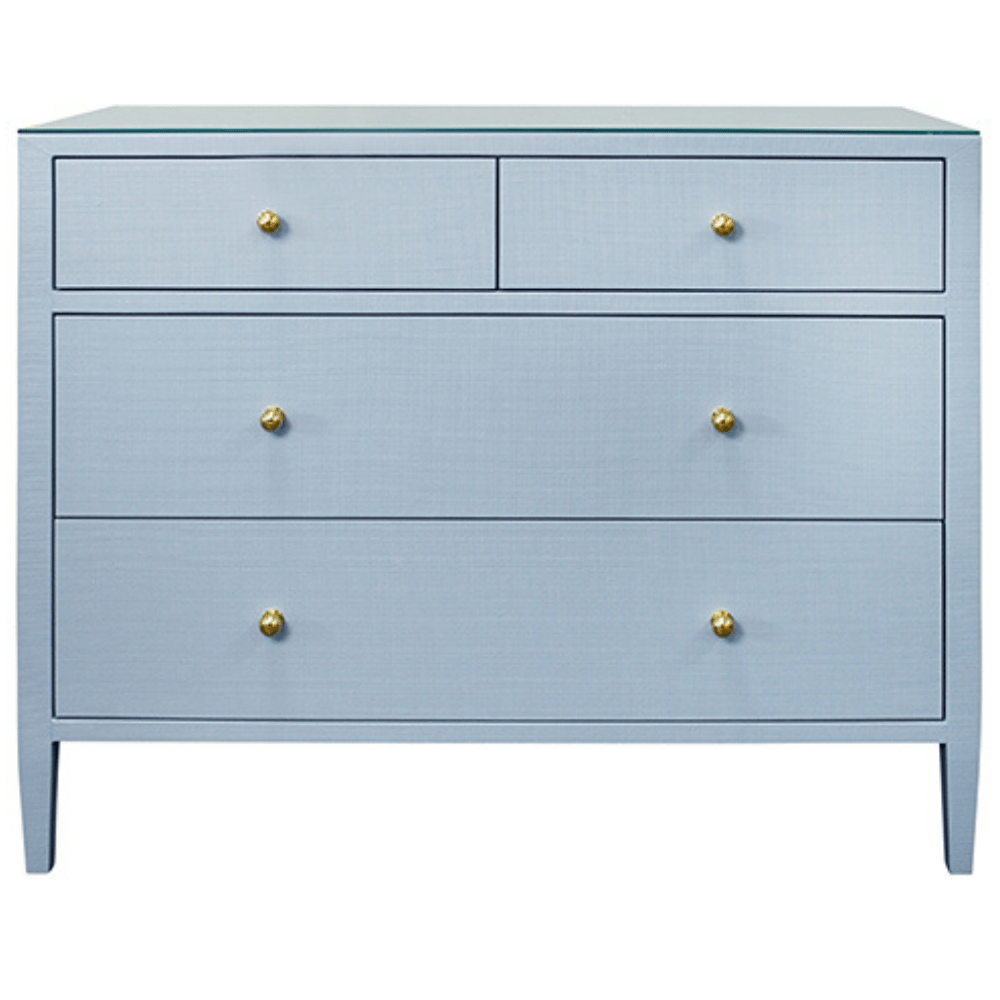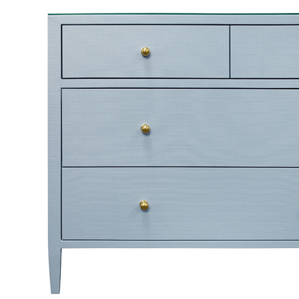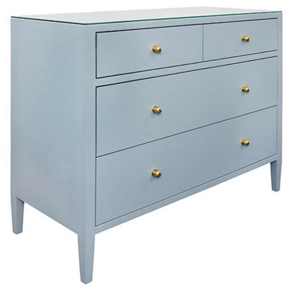 The Michelle Chest blends classic elegance with contemporary refinement and topped with a sleek glass surface. Its clean-lined silhouette features spacious drawers accented with minimalist metal hardware, offering a sophisticated yet functional storage solution for any bedroom or living space. The subtle textural details of the linen complement the smooth glass top, striking the perfect balance between comfort and modern style.