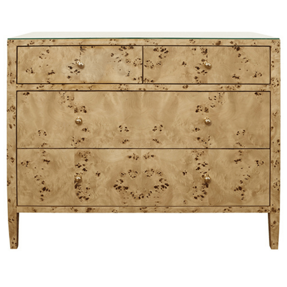 Materials: Wood, Linen, Brass, Burl, and Glass/Mirror