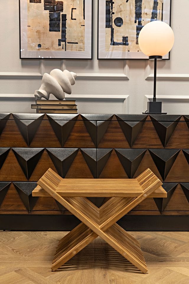 The Nigel Chest is a distinctive and sophisticated piece, crafted from premium mahogany wood and finished with a rich veneer in a hand-rubbed black finish. The chest features a bold, geometric front design composed of triangular facets, creating a dynamic and three-dimensional visual effect. The warm tones of the natural wood are enhanced by the contrasting black finish, giving the piece an elegant, modern aesthetic. With its unique texture and refined craftsmanship, the Nigel Chest is both a functional storage solution and a striking statement piece, perfect for adding a touch of contemporary sophistication.