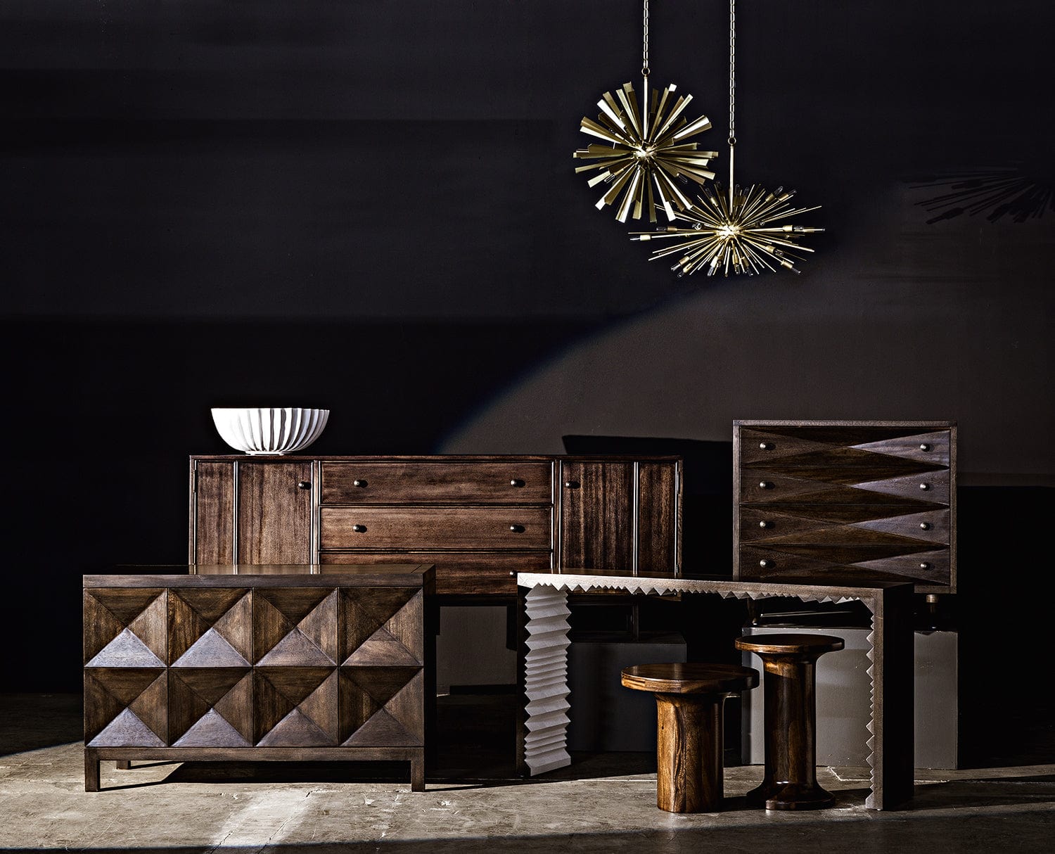 A straightforward walnut chest is elevated with the addition of multiple large diamond-shaped carvings. The elaborate carvings take center stage here, and we keep the rest simple, with metal pulls, peg legs and a natural finish.