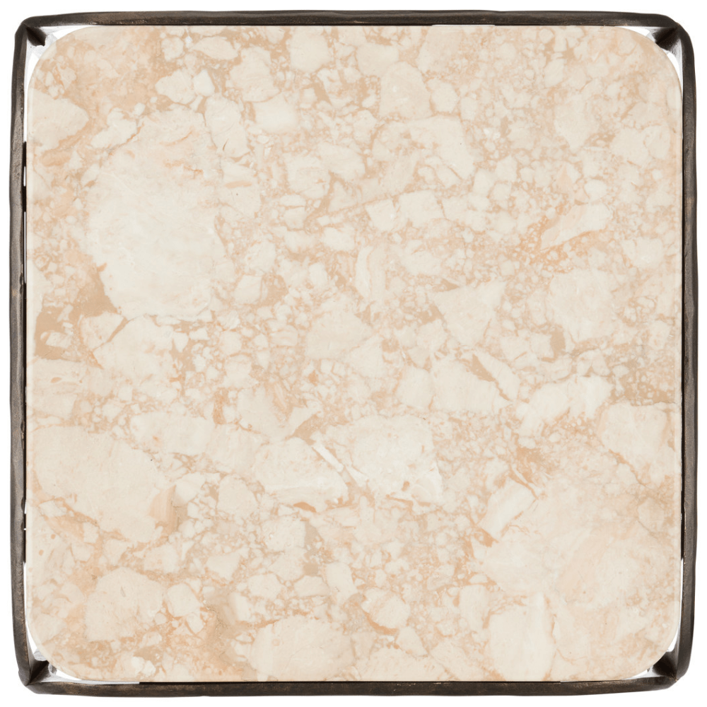 The Crema Side Table combines industrial elegance with artisanal craftsmanship. Its metal frame, finished in a warm bronze, has a hand-forged appearance that adds depth to its streamlined silhouette. Supporting a luxurious crema marble top, the frame folds down and away at the corners, creating a striking forked design that echoes the refined detail found at the ends of the stretcher where it meets the legs.