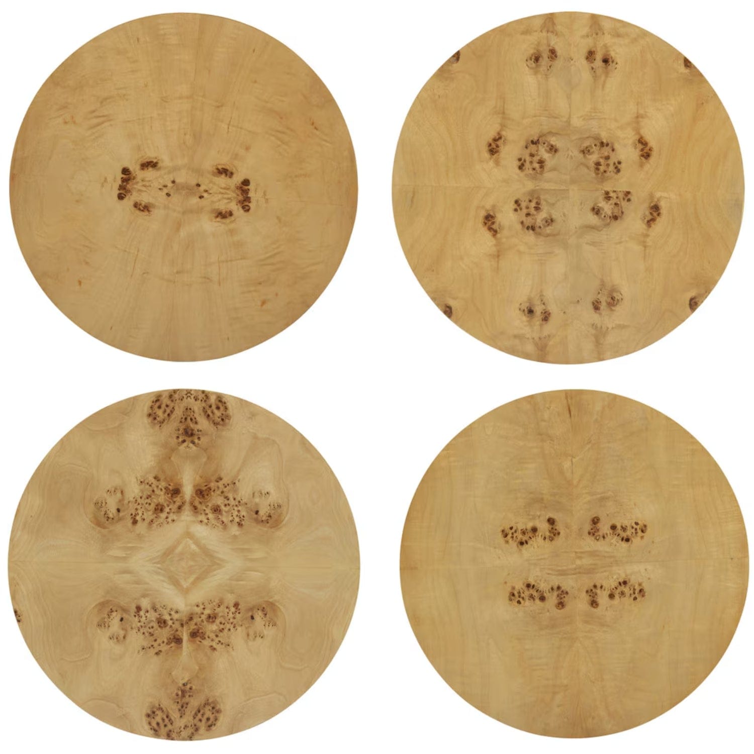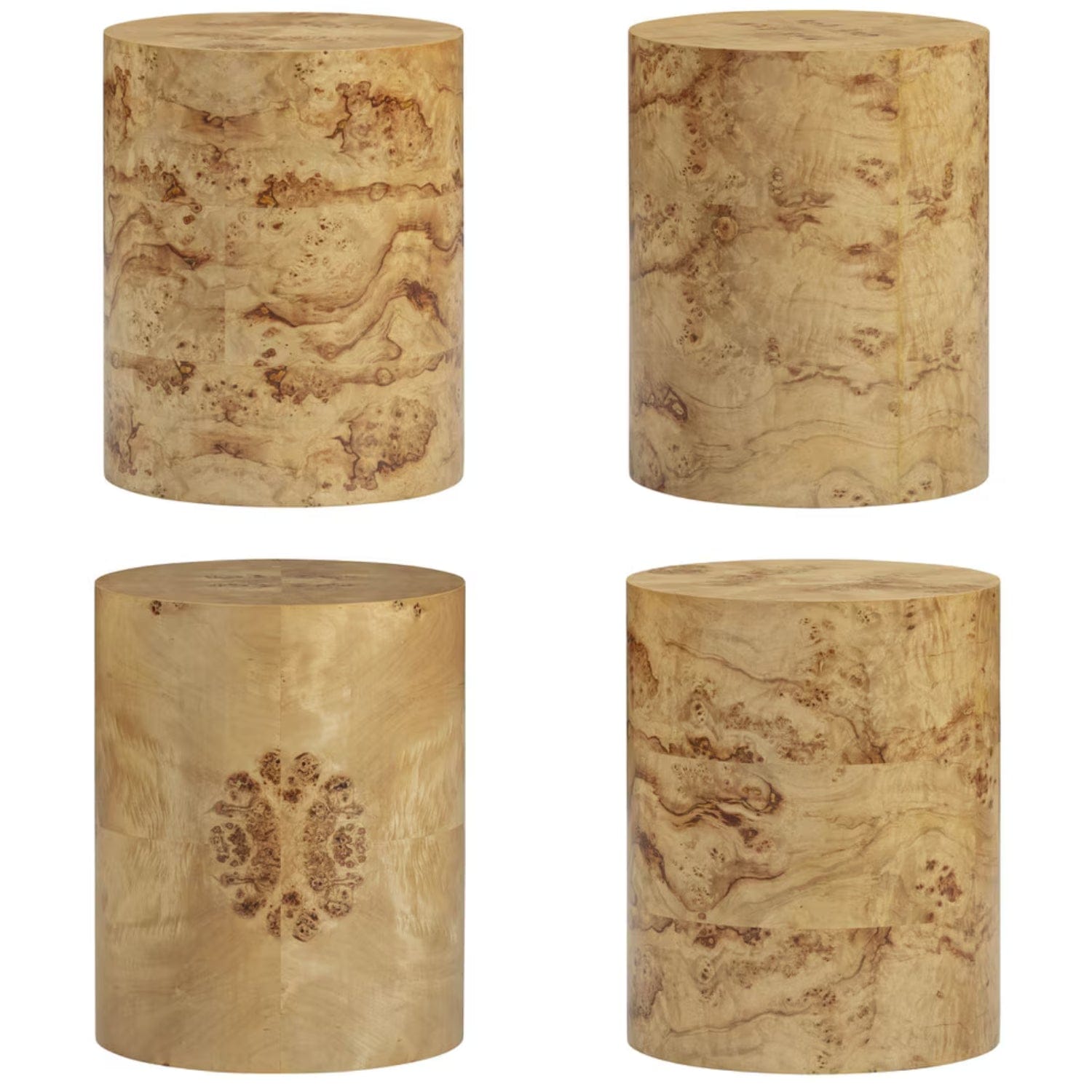 Grounded in organic warmth and visual rhythm, the Figaro Natural Burl tables bring sculptural serenity to any room. Wrapped in richly grained burl veneer with bookmatched panels and a seamless, weighty base, each drum silhouette is a quiet statement piece, made entirely unique by the natural variation in burl wood.