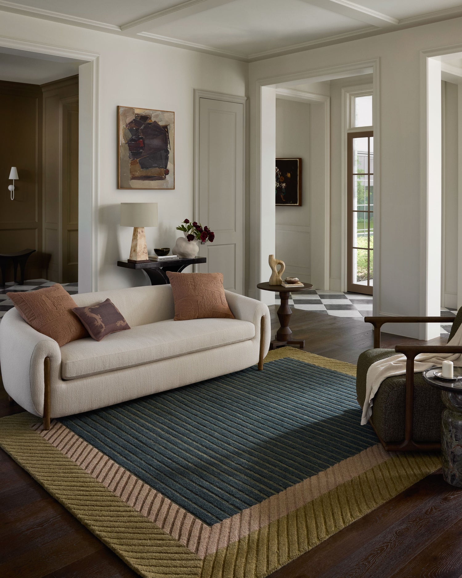 The Madi Collection is a colorful area rug by Brigette Romanek x Loloi featuring abstract designs in a rich palette of dusky blue, natural clay, earthy green, and muted gold. The varied, figurative designs are outlined with a raised wool pile for even more depth to sink into. Madi is hand-tufted in India and GoodWeave-certified, ensuring our commitment to ethical production and the support of weavers' communities. Some shedding is expected and a natural characteristic of wool rugs; we recommend vacuuming frequently without a beater bar.