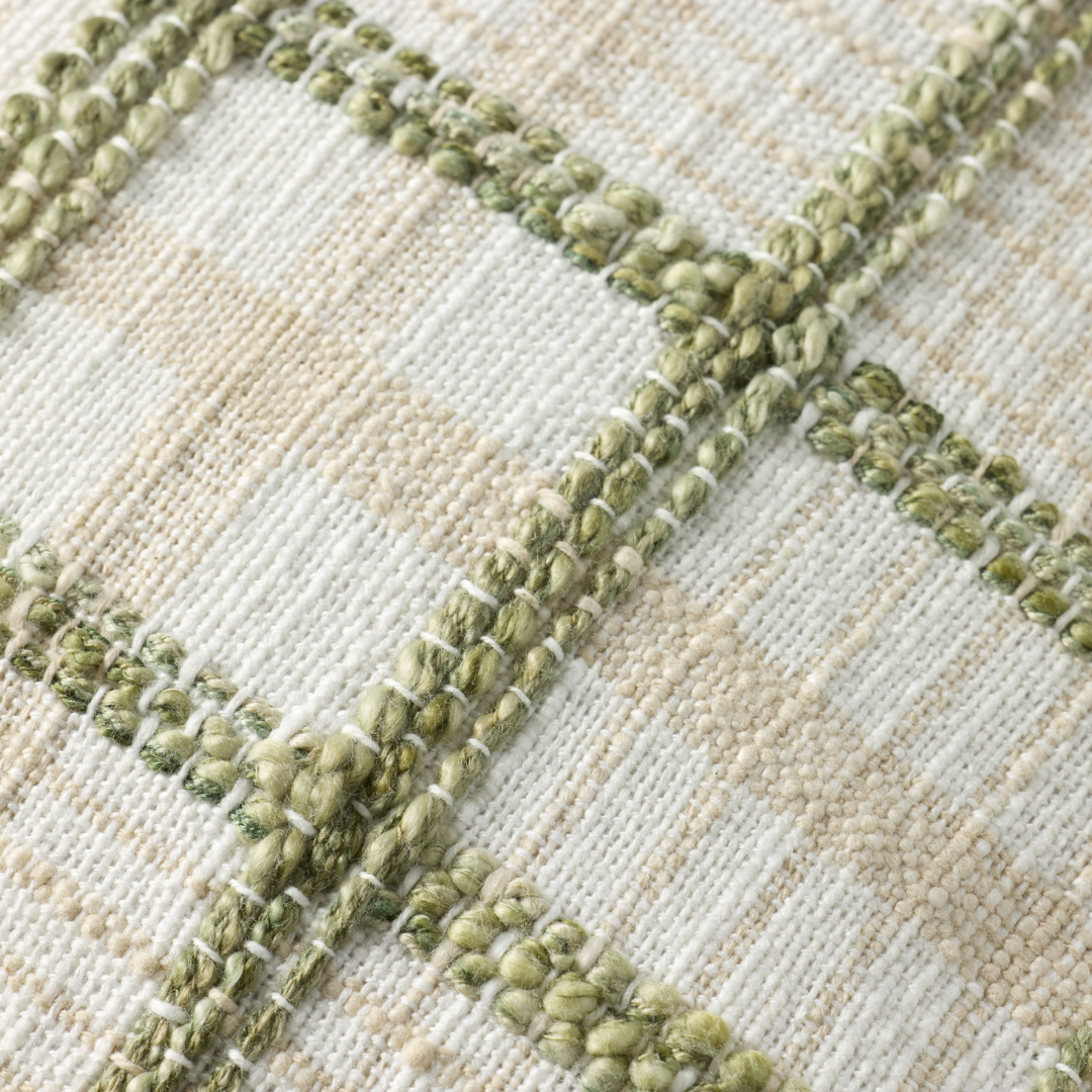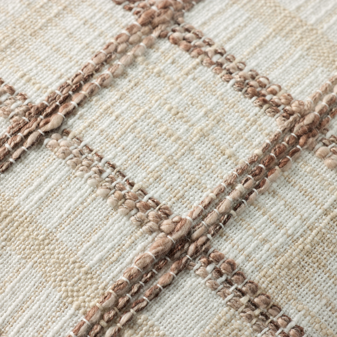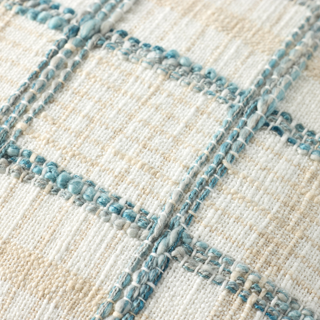 The Norman throw pillow by Chris Loves Julia x Loloi features a textured grid design with a soft color palette and white background, a versatile pillow for living rooms, dens, and bedrooms. The pillow cover is made of cotton and polyester in India.