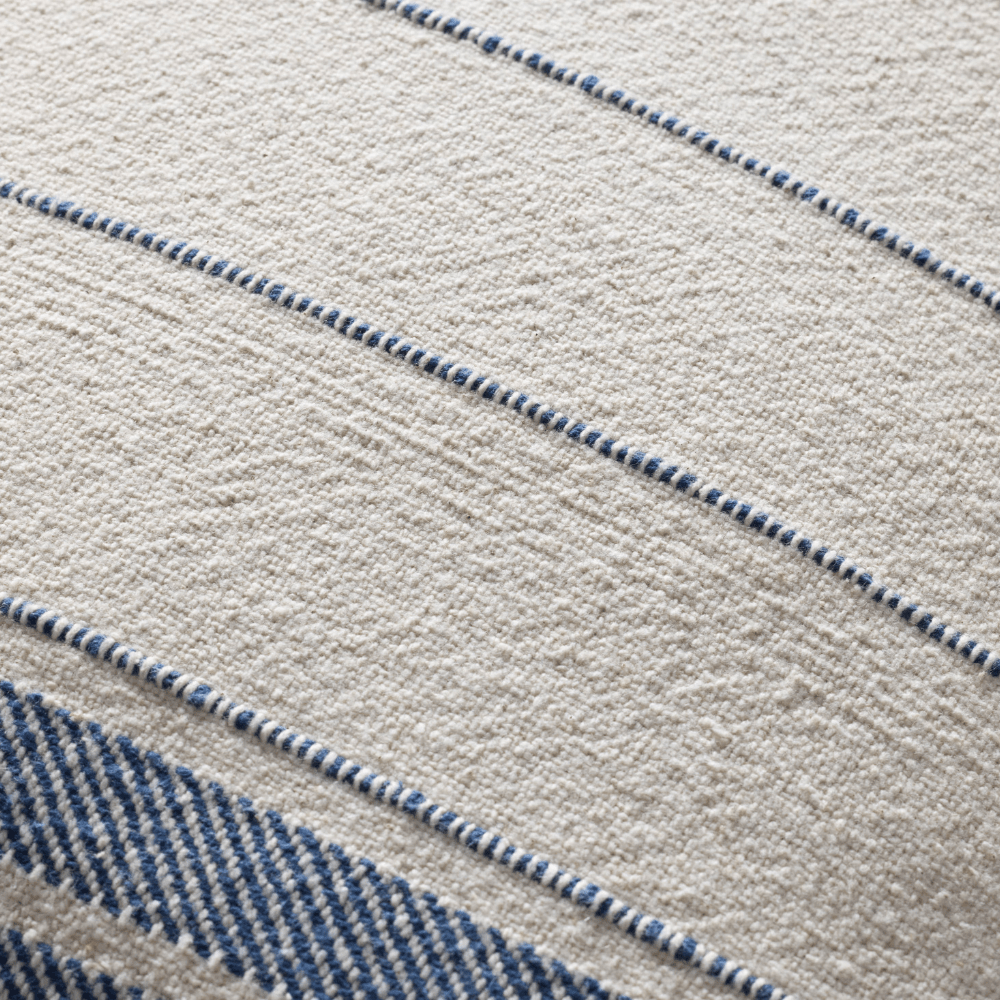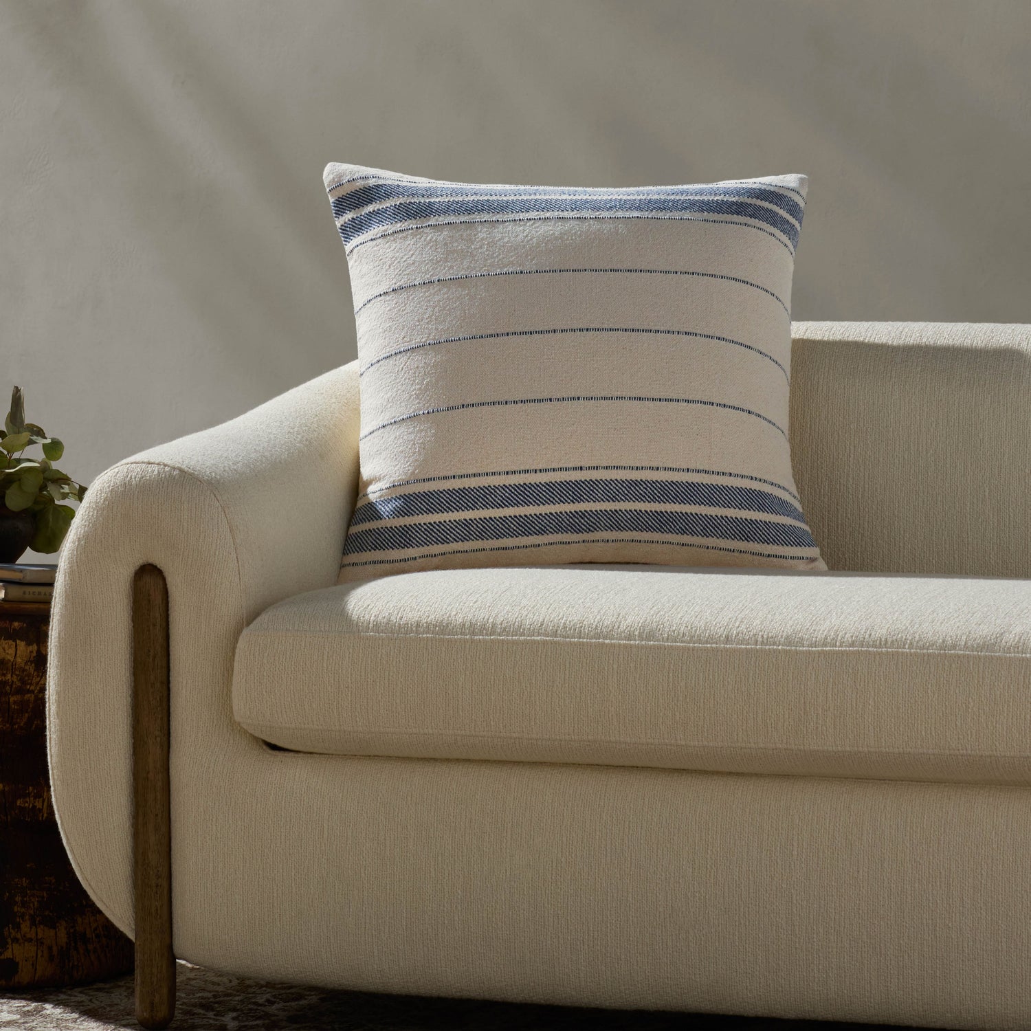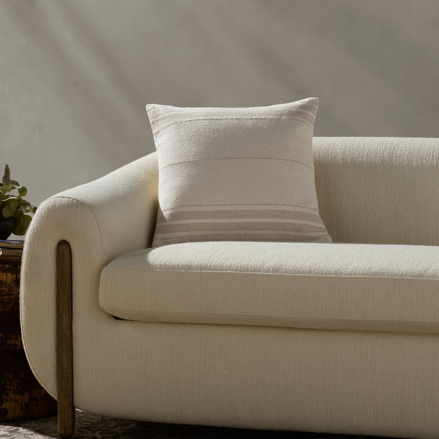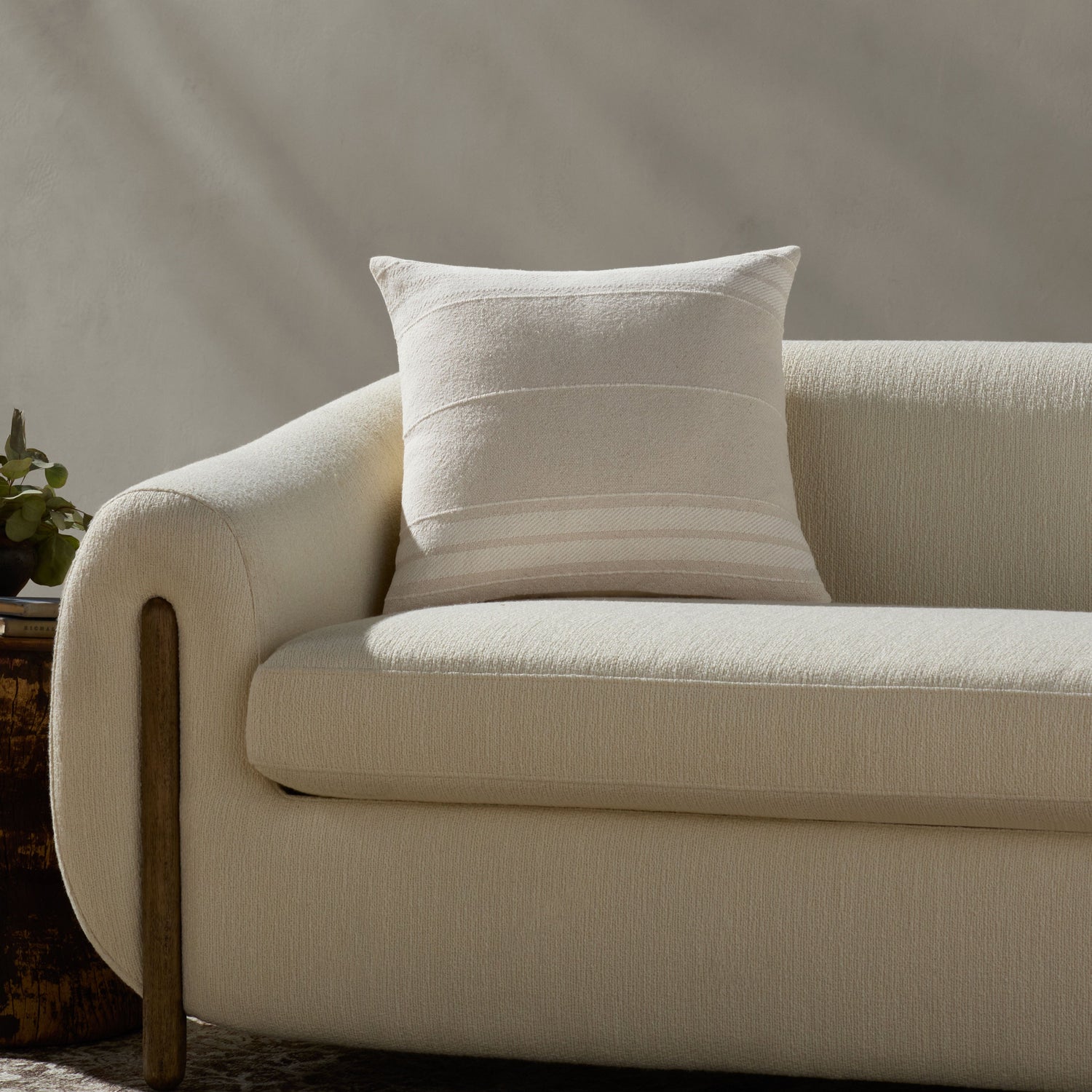 The Selena throw pillow from Magnolia Home by Joanna Gaines x Loloi features ivory and beige stripes against a natural beige background, reminiscent of vintage flour sacks. The pillow cover is hand-woven of 100% cotton in India with a versatile size for living rooms and bedrooms of all home decor styles.