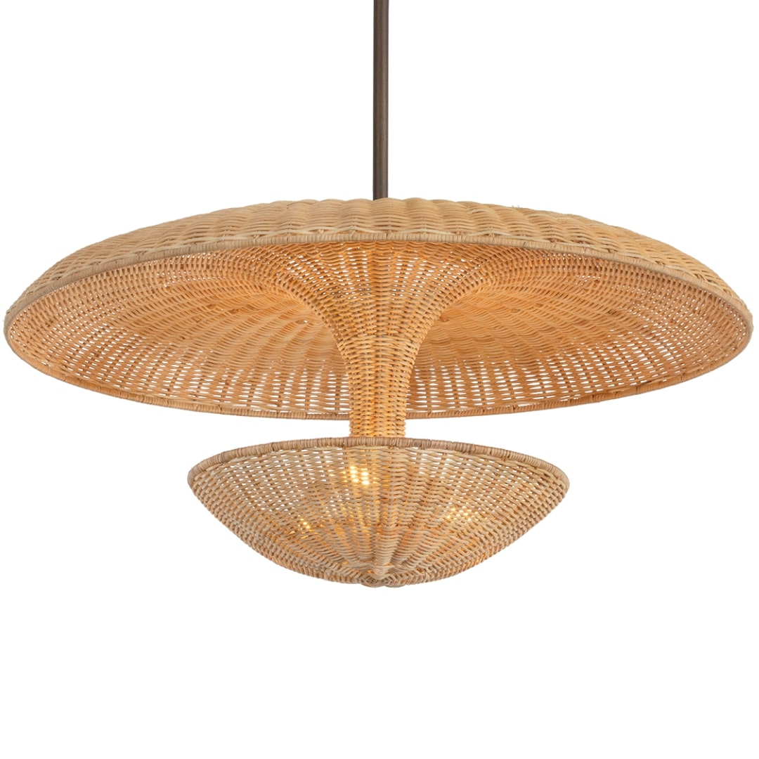 A force of nature, Draco blends mid-century style with artisanal craftsmanship. Supported by a Bronze Leaf stem, the silhouette is based on a classic 1960s reflector form with a handwoven twist. The natural openness of the light natural wicker weave allows light to filter through all sides of the fixture. Available as a 3-light semi-flush or 3-light pendant in two sizes, Draco makes for an impressive focal point.