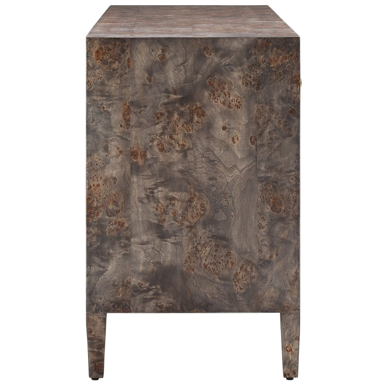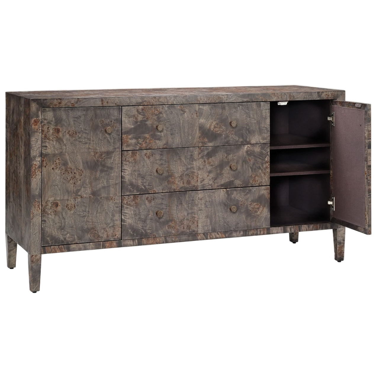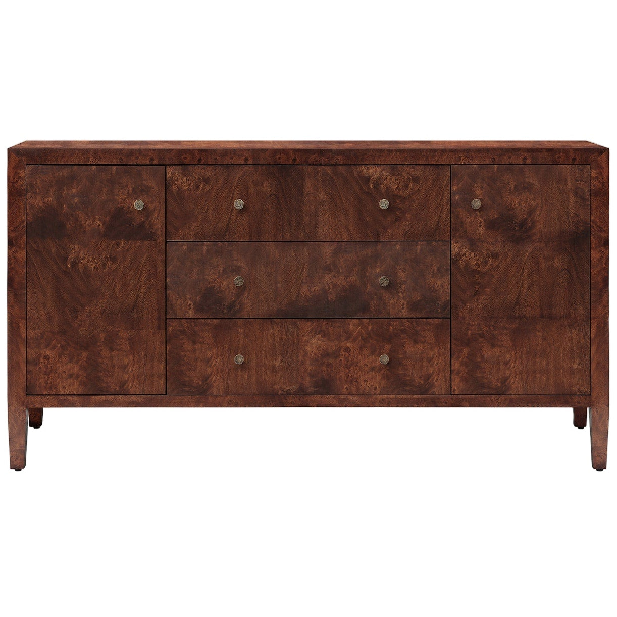 Made from naturally contrasting mappa burl and a sleek knob per drawer, this piece is as elegant as it is functional. Given the nature of the material, each pattern is one-of-a-kind.
