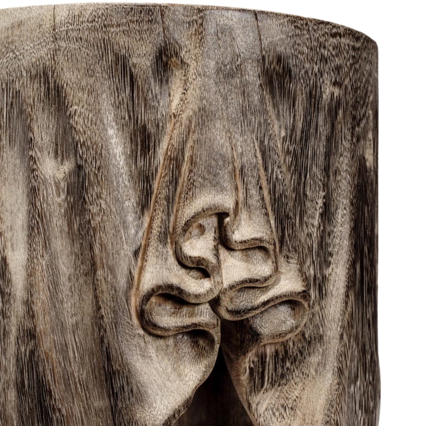 The Burke stool features a solid, stump-inspired design with the illusion of draped fabric along the sides, making for an intriguing silhouette. It also includes a contemporary twist on baroque-style feet for a shape like no other. Due to the natural material, some stools might have cracks along the top, which have been secured with butterfly dowels.
