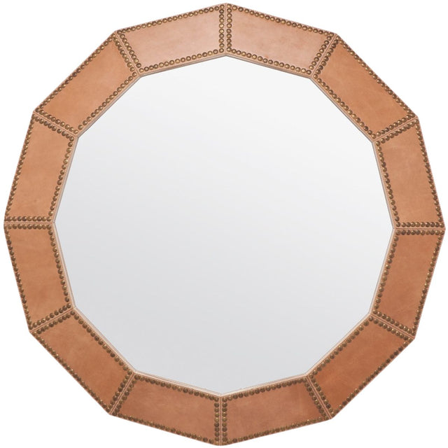 An abundance of brass grommets give this tailored piece a decorative edge. Full-grain aged camel leather covers the spiral orb web shape of the Hume. Large studs lining the perimeter define each piece of the frame, creating a warm and casual mirror. Natural variations in this material may occur. Slight differences in color and texture are characteristics of this collection's aged full-grain leather. This durable, high quality leather may show inherent markings, distressed appearance, and variations in pattern.