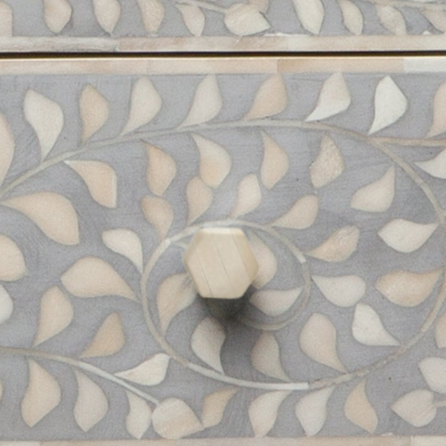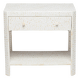 Our Lexi nightstand features clipped corners and a beautiful design, highlighting a simplified and updated Indian pattern. Created with camel bone painstakingly hand-set in resin. The simple structure of the piece allows the craftsmanship to shine while highlighting a worldly sensibility.
