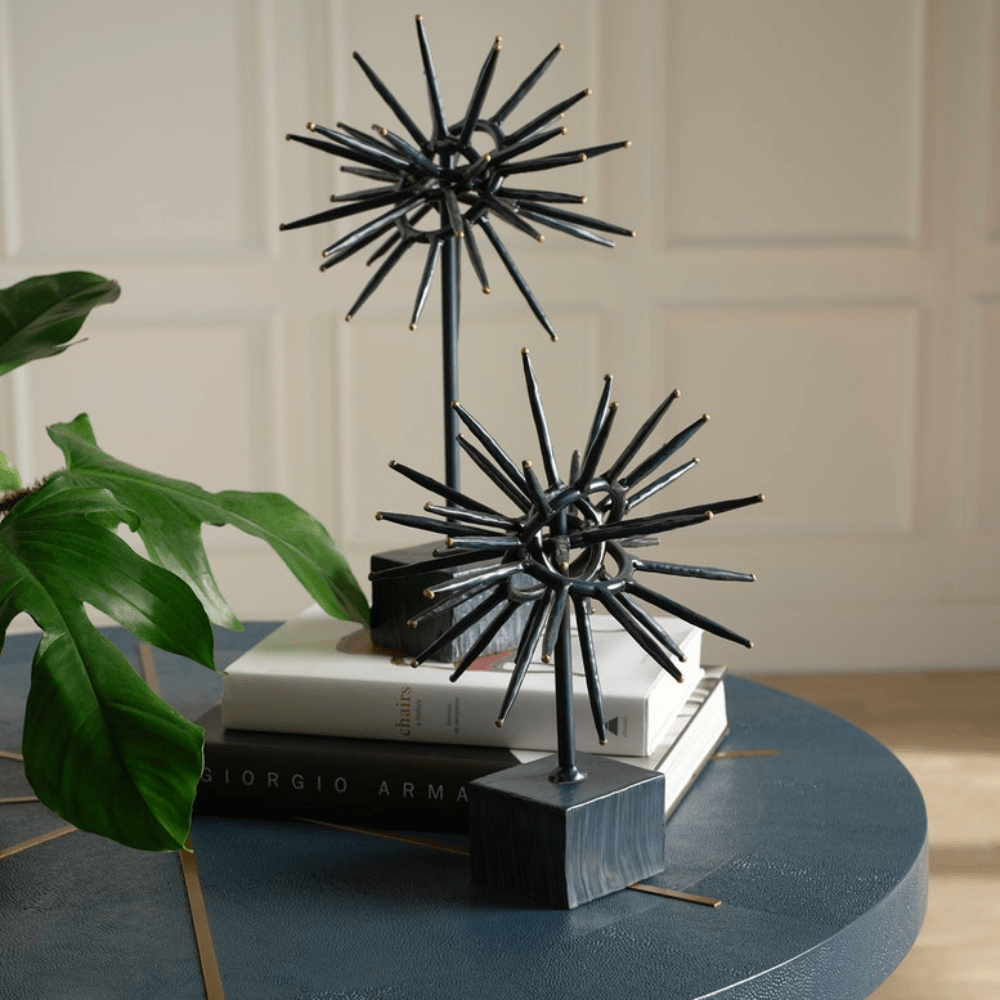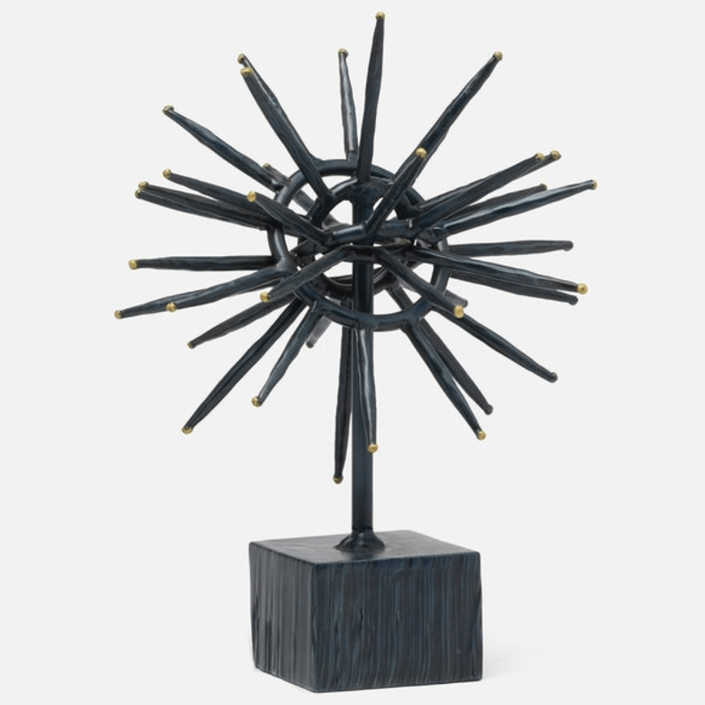 Add a touch of abstract artistry to a space with the set of Rhine objects. Made from iron, these unconventional objects resemble the look of a starburst sculpture.