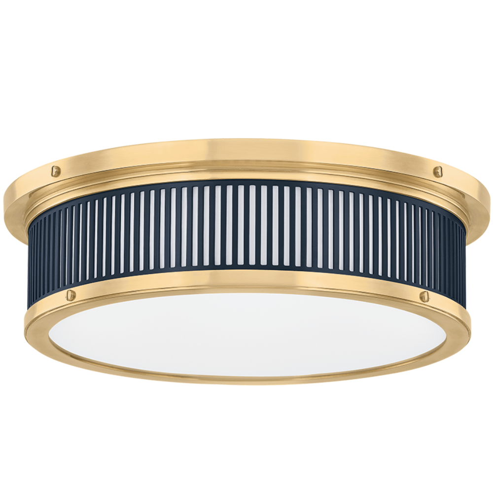 By blending classic and contemporary elements, the Ashdown family offers a new take on sophisticated ceiling lighting. Available in both square and rounded shapes, these flush mounts feature Mark D. Sikes' signature brass screw accents and a white glass shade. The distinctive geometric perforations on the frame provide another decorative detail. Choose from an Aged Brass and Darkest Blue finish combination, or an Aged Brass and Off White pairing.