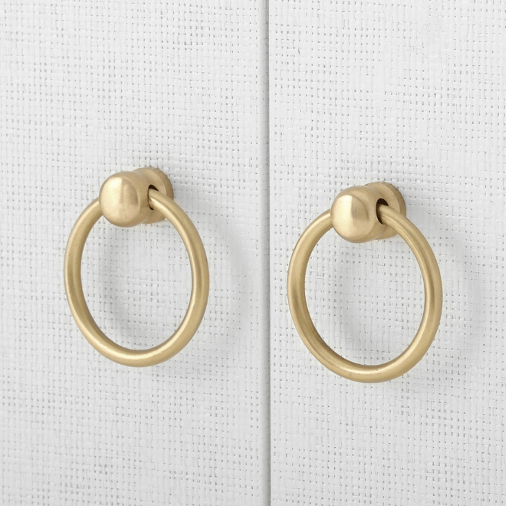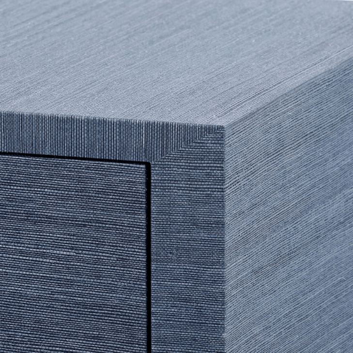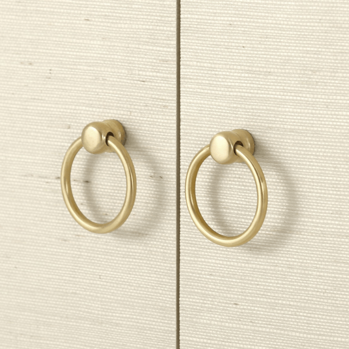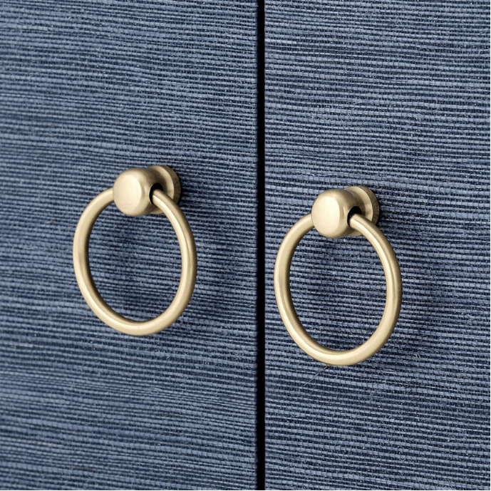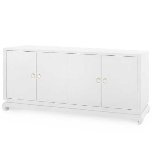 A sophisticated piece for any of your storage needs, the Meredith Extra Large 4-Door Cabinet brings handsome tailoring and luxurious finishes to a study, dining room, or home entertainment area. Its classic silhouette finds a dash of decorative refinement in its base, which features delicately curved Chow-style feet and an inset edge that adds dimension to its solid, elongated form. Four doors make up its facade, adorned with glittering gold finish ring pulls. Inside, four fixed shelves, richly stained, provide generous space for glassware, linens, or toys. The Meredith is also ideal for neatly arranging electronics, with two back openings for cables and wires. This piece is finished in lush, lightly textured lacquered grasscloth—a signature design detail showcasing Villa & House’s high-end craftsmanship.