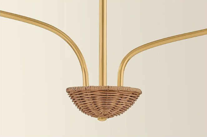 The floral-shaped light wicker shades of Kehlani bring a sense of instant renewal to a space. Aged Brass metalwork follows the curves of each shade, creating a sense of continuity that culminates in a decorative ball fitter. This family is an artisanal alternative to more traditional designs.