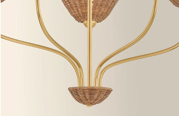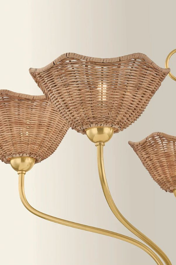 The floral-shaped light wicker shades of Kehlani bring a sense of instant renewal to a space. Aged Brass metalwork follows...
