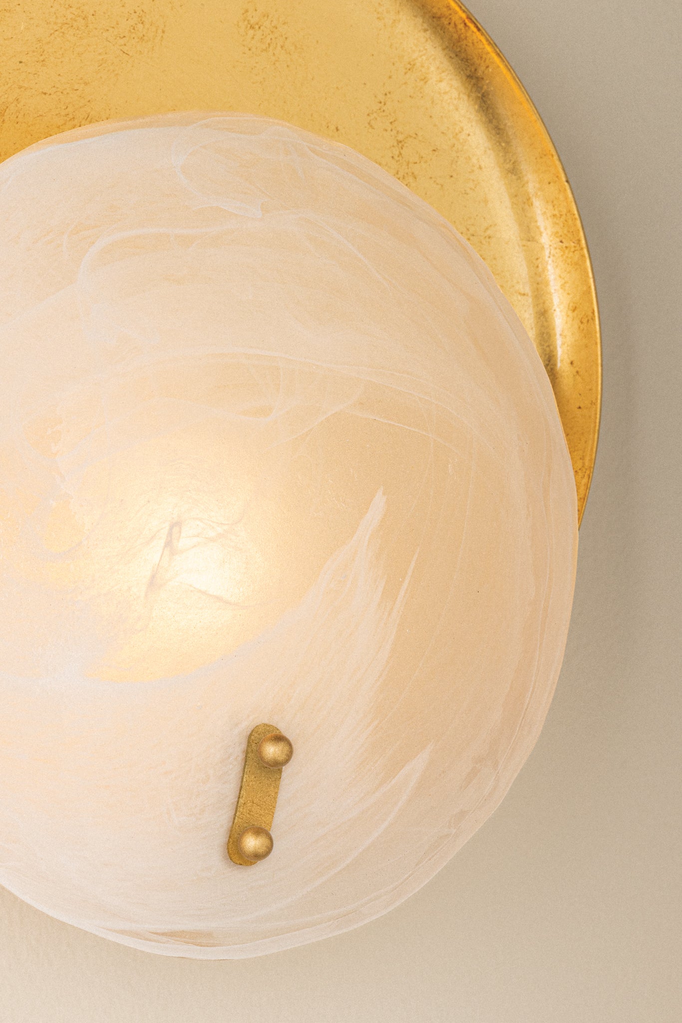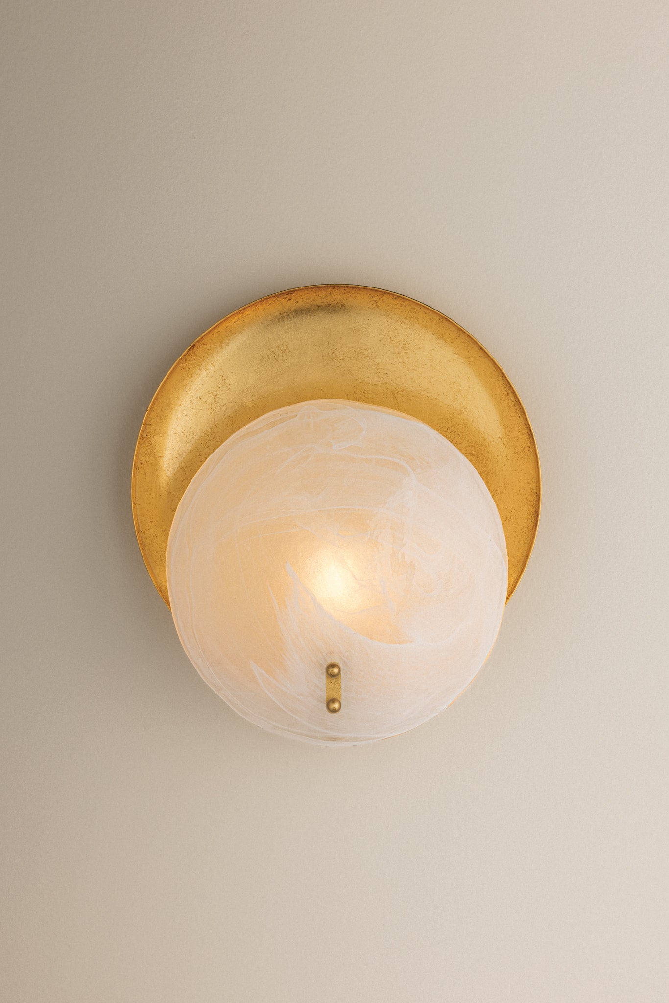 Shanette elevates a simple, rounded sconce form with statement materials. The soft white swirls of the Piastra glass shade create the illusion of gentle motion when illuminated. A metal reflector in Vintage Gold Leaf adds depth and dimension behind the light, complementing the gold pins at the front of the fixture. This softly poetic piece is suitable for any space.