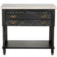 A transitional side table with two drawers and a pull-out writing tray. Timeless brass accents and rich textural contrasts lend versatility to any interior setting.
