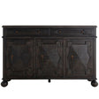 Building on the success of its smaller predecessor the Ezekiel Sideboard Dark expands both in size and presence This updated three-door version amplifies its signature charm featuring a bold geometric faceted front design that's rich with texture and architectural depth The dark cerused finish enhances the natural grain of the mindi wood while antique bronze hardware and classic bun feet complete the look with a grounding touch of tradition.