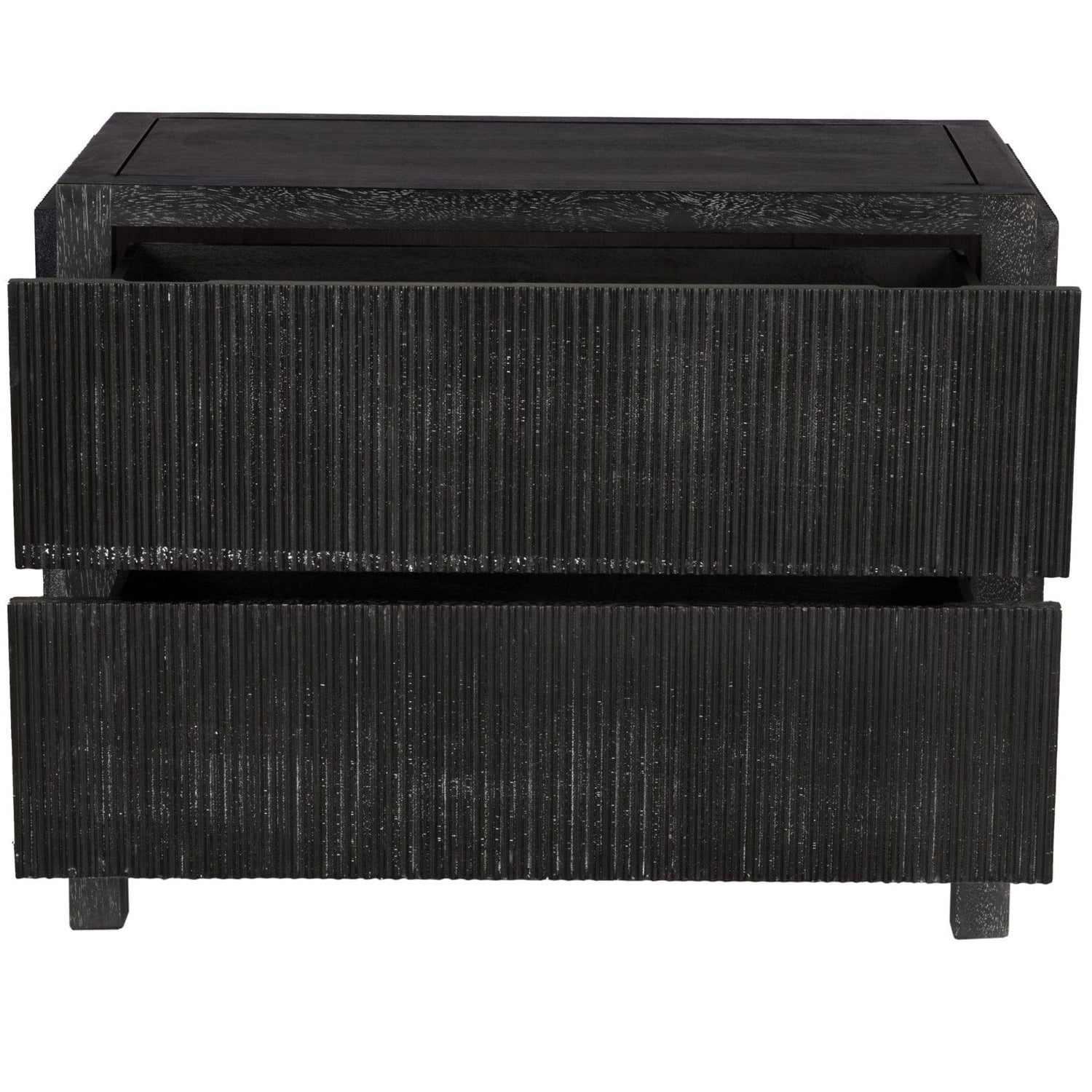 This two-drawer side table showcases vertical ribbed detailing in a deep black and greige walnut finish, elevated on minimal block legs merging modern texture with architectural simplicity for a bold, sculptural statement.