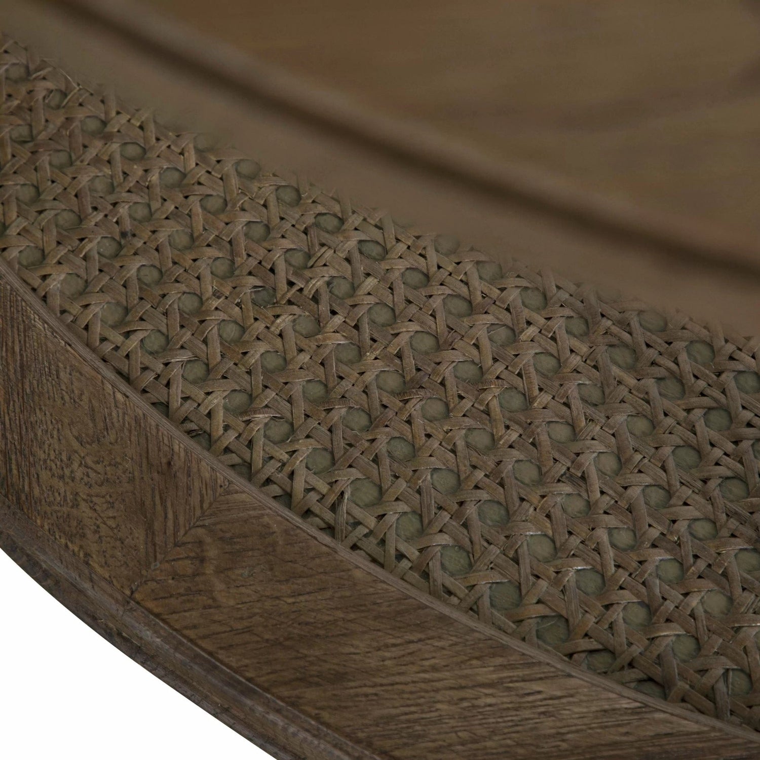 The Sabine Coffee Table blends classic charm with light airy elegance Crafted from solid oak in a natural satin finish this 36' round table features a tempered glass top that offers a clear view of its beautifully woven cane lower shelf - perfect for displaying books décor or keeping essentials close at hand Turned wood supports add a traditional touch while the mix of textures - glass oak and cane - creates a layered organic feel that suits a variety of interior styles