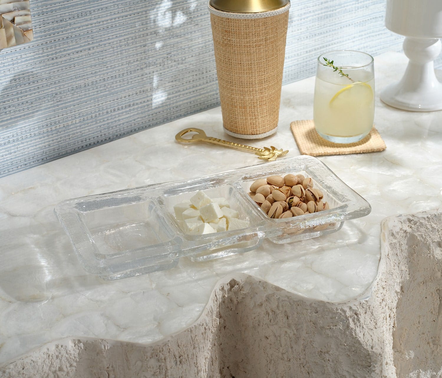 Entertain in style with Livingston, a 3-section snack tray crafted from clear hand-pressed glass for timeless elegance and practicality. Versatile for any occasion- from serving gourmet snacks to artisanal condiments to cocktail hour garnishes.