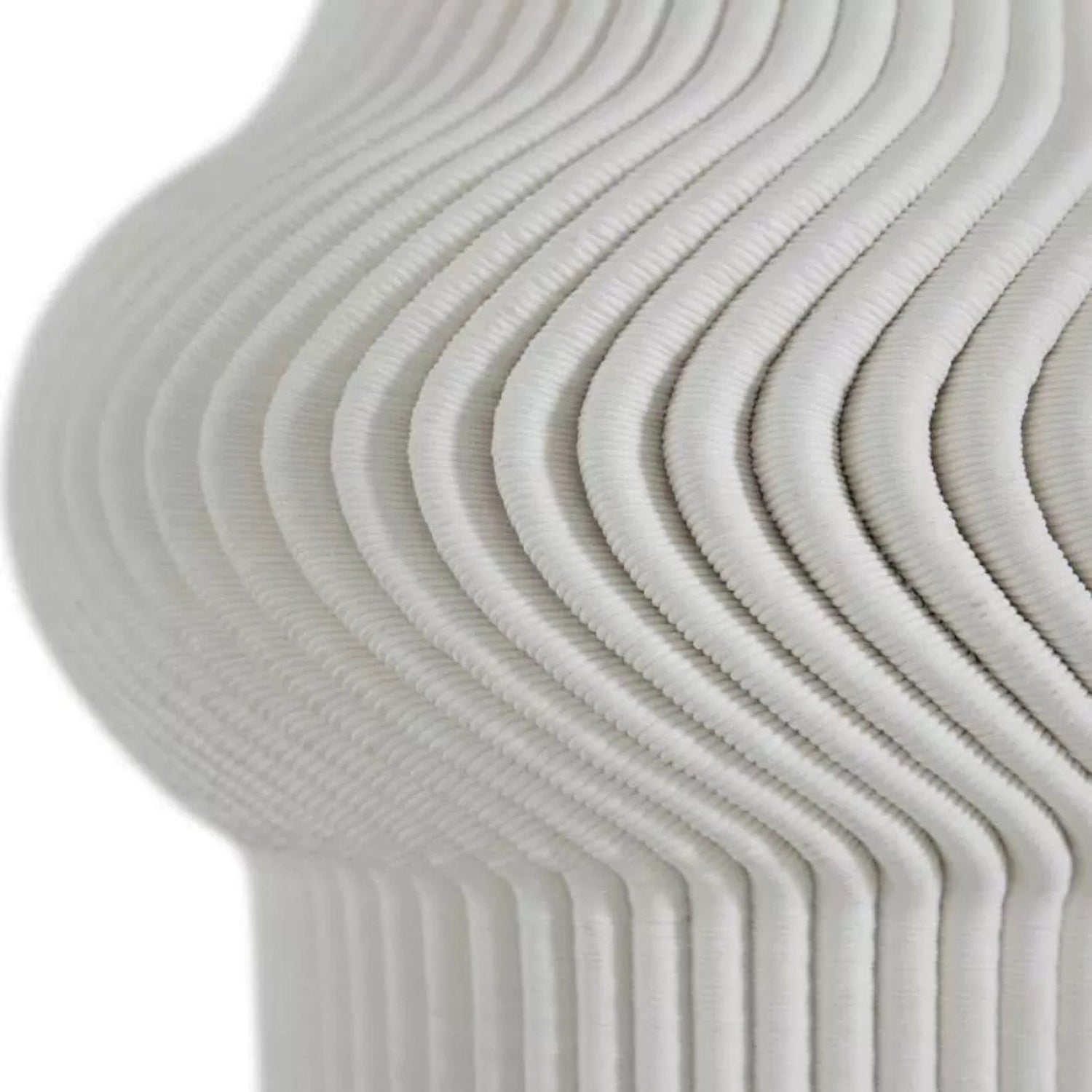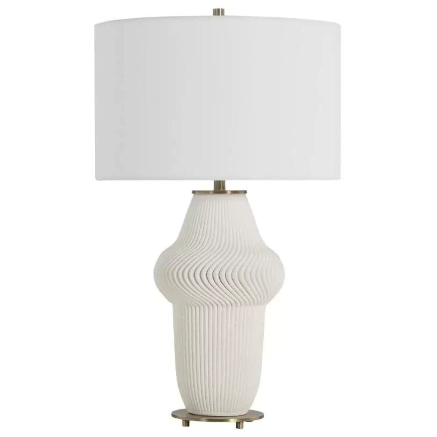 The Elara Table Lamp stands 26 inches high with a white linen shade and an artful ceramic fluting Created from 3-D printed white ceramic reimagining the detailed modern form with traditional materials creates sculptural appeal