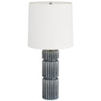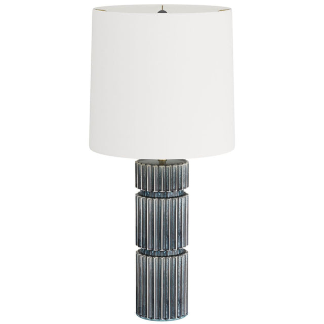 Sculpted in ceramic and finished in a ocean-reactive glaze, the Annika’s textural fluting is reminiscent of mechanical gears. Accented with an antique brass finished support and an off-white linen drum shade, it delivers the perfect marriage of industrial and modern design. Matching ocean ceramic finial, clear silver cord, and three-way rotary switch. Finish will vary.