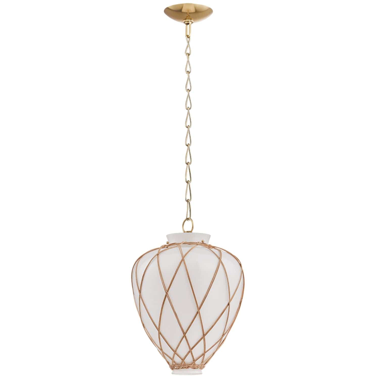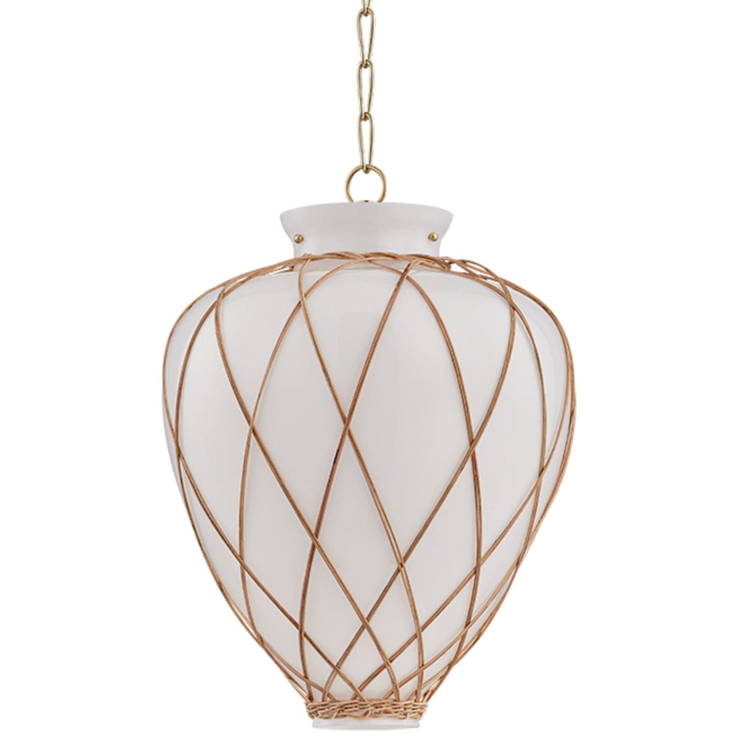 A latticework rattan cage wraps around the glass urn-shaped shade of the Apple Valley pendant, creating a textural, net-like effect. Pairing translucent opal glossy glass and rattan results in an intriguing play of light on the surfaces surrounding this lantern-like silhouette. An Aged Brass-finished chain and small rivets support the fixture, adding a polished note. Available in 13” and 17” sizes.