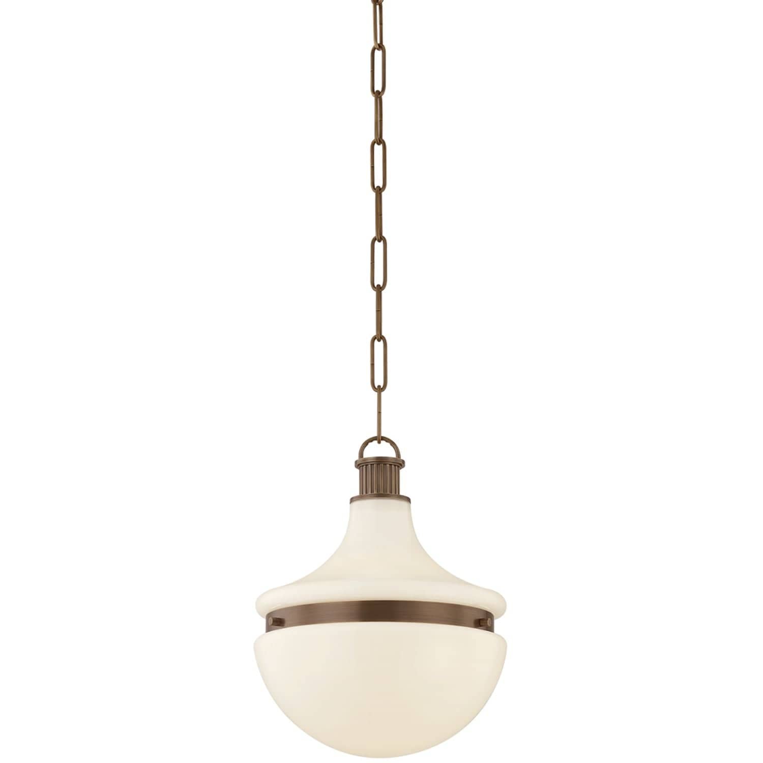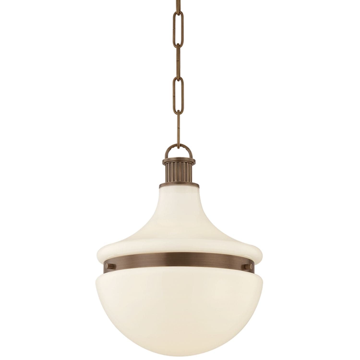 The Barryville pendant filters historical design inspiration through a contemporary lens. Paying homage to the work of Peter Behrens, it features an antique silhouette reimagined for today. The Heritage Bronze metalwork pairs beautifully with the shiny opal glass shade. Details like the architectural fluted socket cups, decorative top loop, and uniform chain root Barryville in this century. Comes as one light available in two sizes.