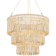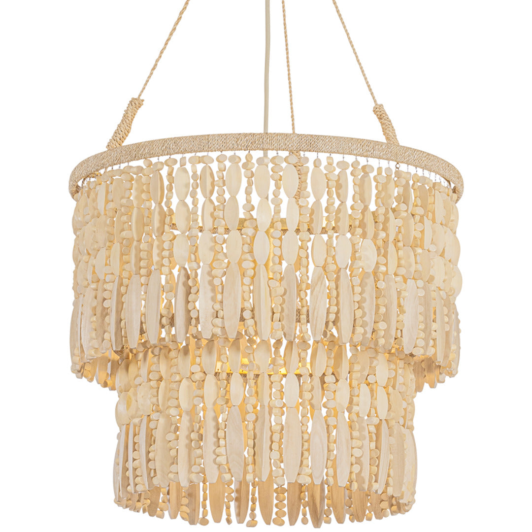 Evoking the natural beauty of the coast, the Ben chandelier features a cascading silhouette with intricate, handmade detailing. Strings of wooden beads form fluid tiers that move gently, creating a dappled lighting effect. A woven abaca wrap ring anchors the design, which is available in two sizes. Vintage Gold Leaf fittings balance the organic textures with a bright detail.