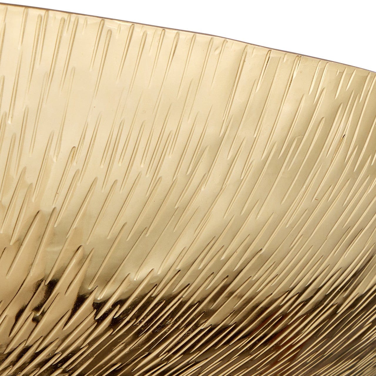 The Origo Semi-Flush Mount has a shade in an upturned bowl shape that is made of aluminum with a polished brass finish. The gold surface is very textural given there are flowing patterns along it that have been created by hand—a painstaking process. The three-light gold semi-flush is not dimmable.