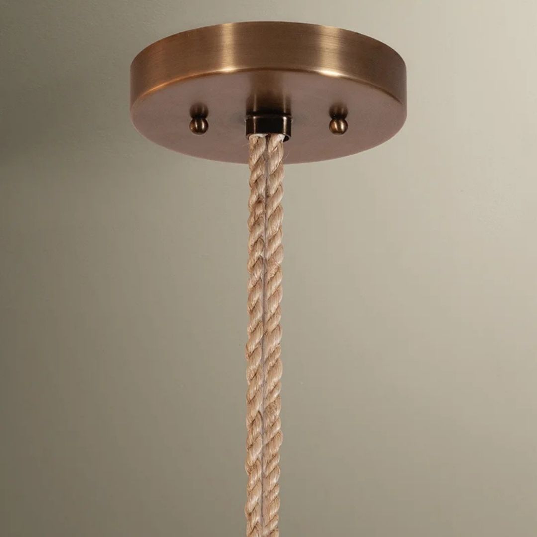 The Redwood family brings coastal ease to contemporary forms. A wheat linen shade is wrapped in abaca rope, diffusing light in warm, dimensional tones. In keeping with the nautical theme, the rope suspension terminates in a knot. The material’s elegant earthiness pairs with rich Patina Brass fittings. Available as a 1-light sconce and 1-light pendant in two sizes.