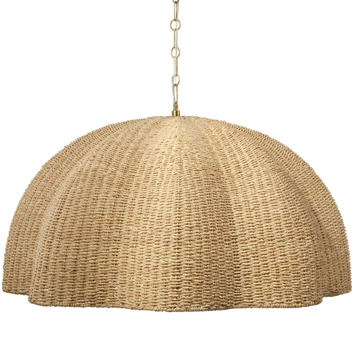 Natural palm leaf is expertly artisan-woven and shaped into a pendant reminiscent of an oversized bloom in this light, airy pendant lamp. Inside the seagrass shade is a large hand-blown glass globe that additionally diffuses the light. The custom chains and canopy are in gently burnished brass. A casually beautiful choice for above a breakfast bar or a kitchen island.