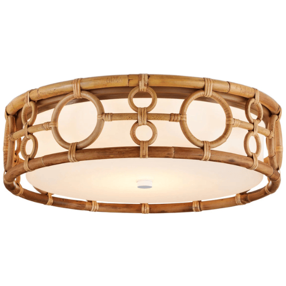 The Tegal Flush Mount has an intricate outer shade made of looping interwoven rattan that is wrapped around a wrought iron frame in a khaki finish. The diffuser is a solid piece of opaque white glass that is lit by integrated LED to glow beautifully. It is attached to the design by an understated finial in a sugar white finish. This one-light fixture is dimmable.