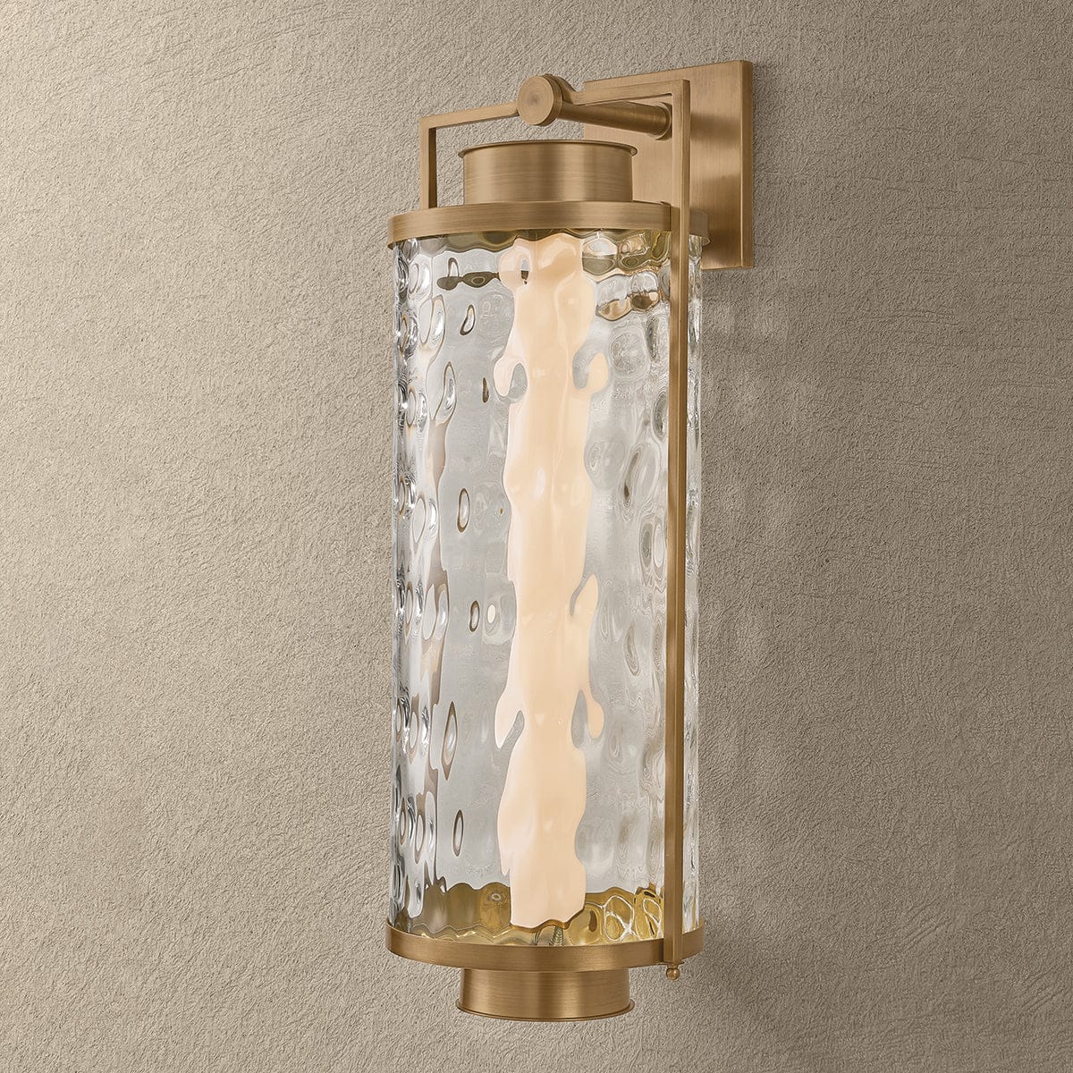 A modern, pared-back take on a traditional lantern, Haddock combines architectural stature with artisanal materials. A solid brass frame with a Patina Brass finish provides durable support for the curved, wavy glass panel. The hammered effect of the clear glass softens the LED illumination, eliminating glare at night. Haddock is available in three sizes to suit any outdoor area.