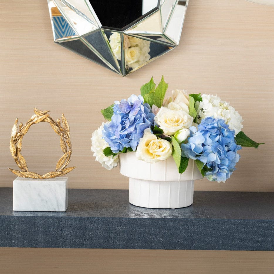 The Apollo Statue is an abstract circlet of gold-leafed laurel leaves atop a glossy marble base. It resembles the victory wreath from the ancient Olympic Games. The Apollo makes for a prefect award, or when used as a pair, for bookends. It's also stunning as a decorative object gracing a side table or etagere.