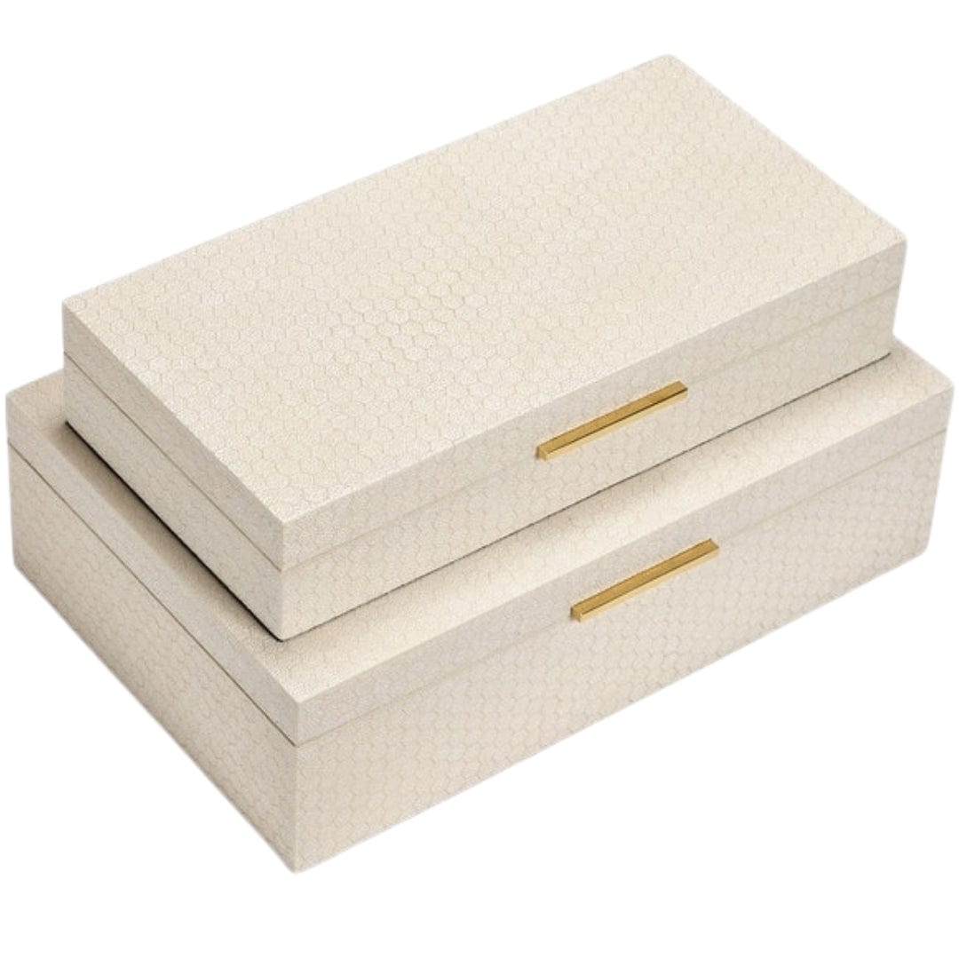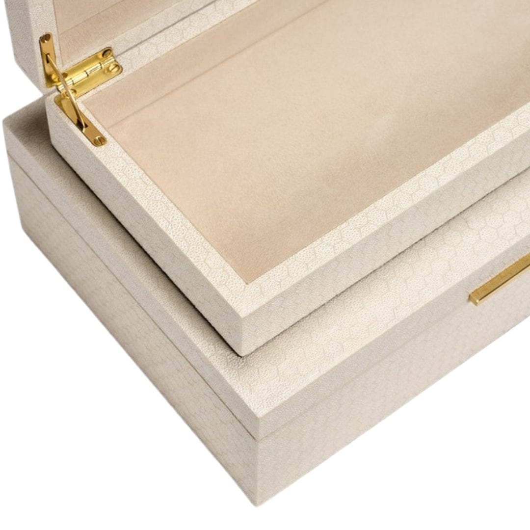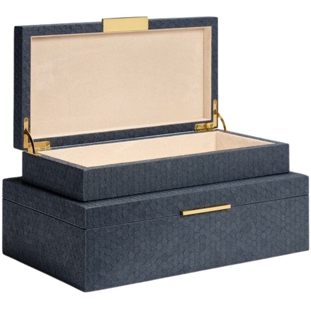 The Grayson box flaunts sleek edges, a honeycomb faux shagreen finish, and gold hardware, making it the perfect home for everyday must-haves.