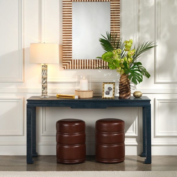 Classic textures of raffia and leather come together to create an irresistible accent with the Hanford hurricane. Its cylindrical shape and textured surface bring an air of luxury to everyday moments.
