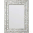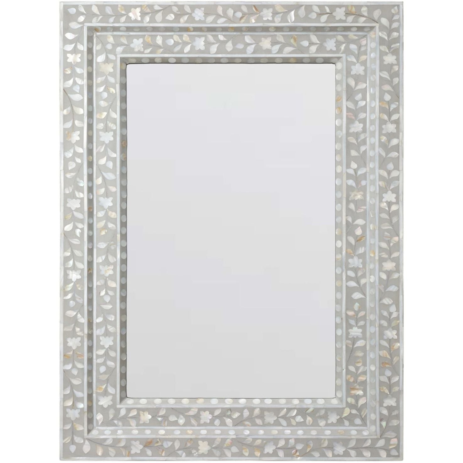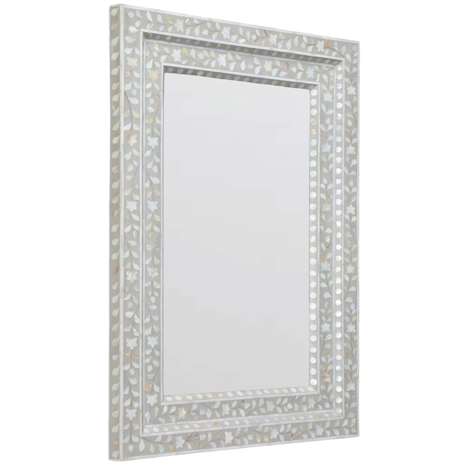 A shell-inlay floral design made from mother-of-pearl displays an iridescent sheen to this ultra-feminine piece. The small, intricate shellwork is handset, giving this mirror a statement sparkle. Mother-of-pearl naturally varies in color, ranging from white to silver to bronze, among other hues, resulting in no two pieces looking exactly alike.