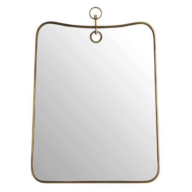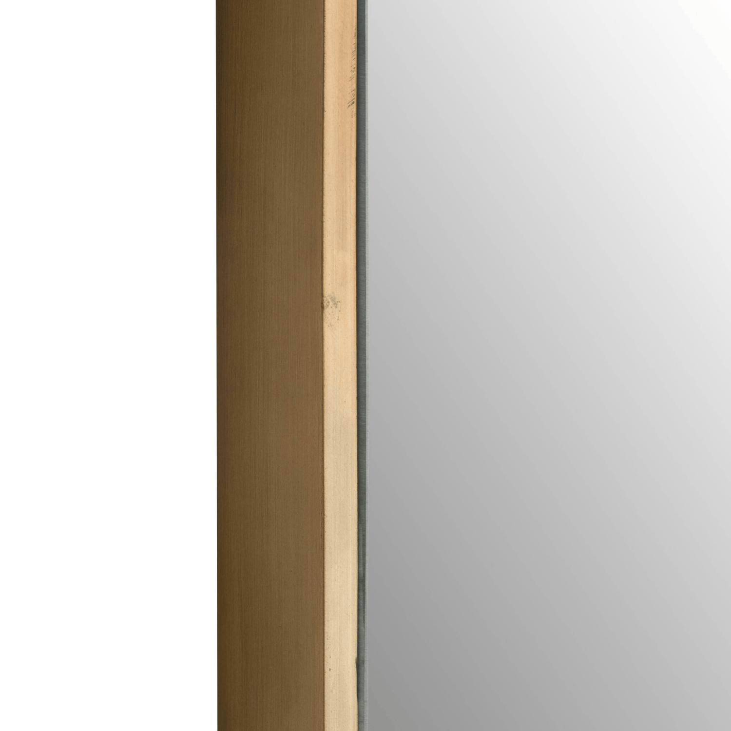 Simple in form yet impactful in scale, our mirror is framed in antique brass iron, the deep-set frame is pierced at the top with elegant hardware detail for vertical hanging. Scaled for a large bathroom, console, or entryway, it is secured with a back cleat. Hanging hardware included. Finish will vary.