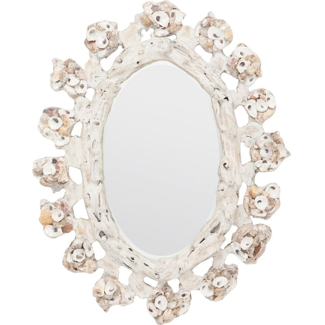 A compelling piece with a coastal vibe, our Talullah features graphic clusters of oyster shells on a recycled wood frame. The uniquely shaped mirror has a seashore look that's anything but precious. With any natural wood item please expect variance in color and character of wood. It is normal for small cracks or openings to appear in the wood over time.