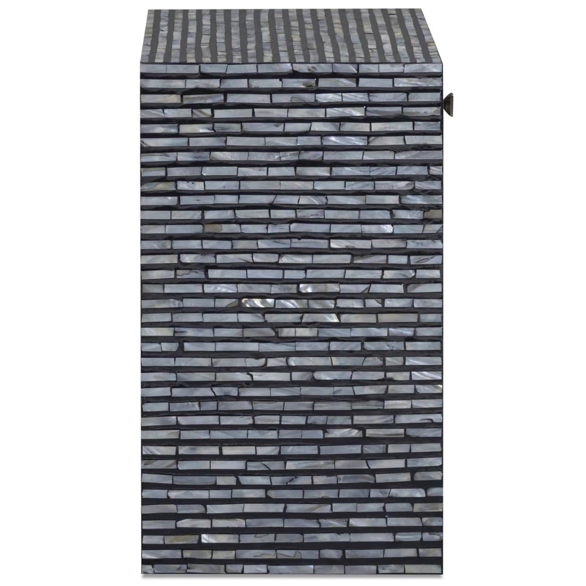 Add a touch of charm to your bedroom with the Cassidy Nightstand. Hand-placed mother-of-pearl shells create luminous motifs that shimmer against a black finish, making this artful piece both beautiful and functional beside your bed.