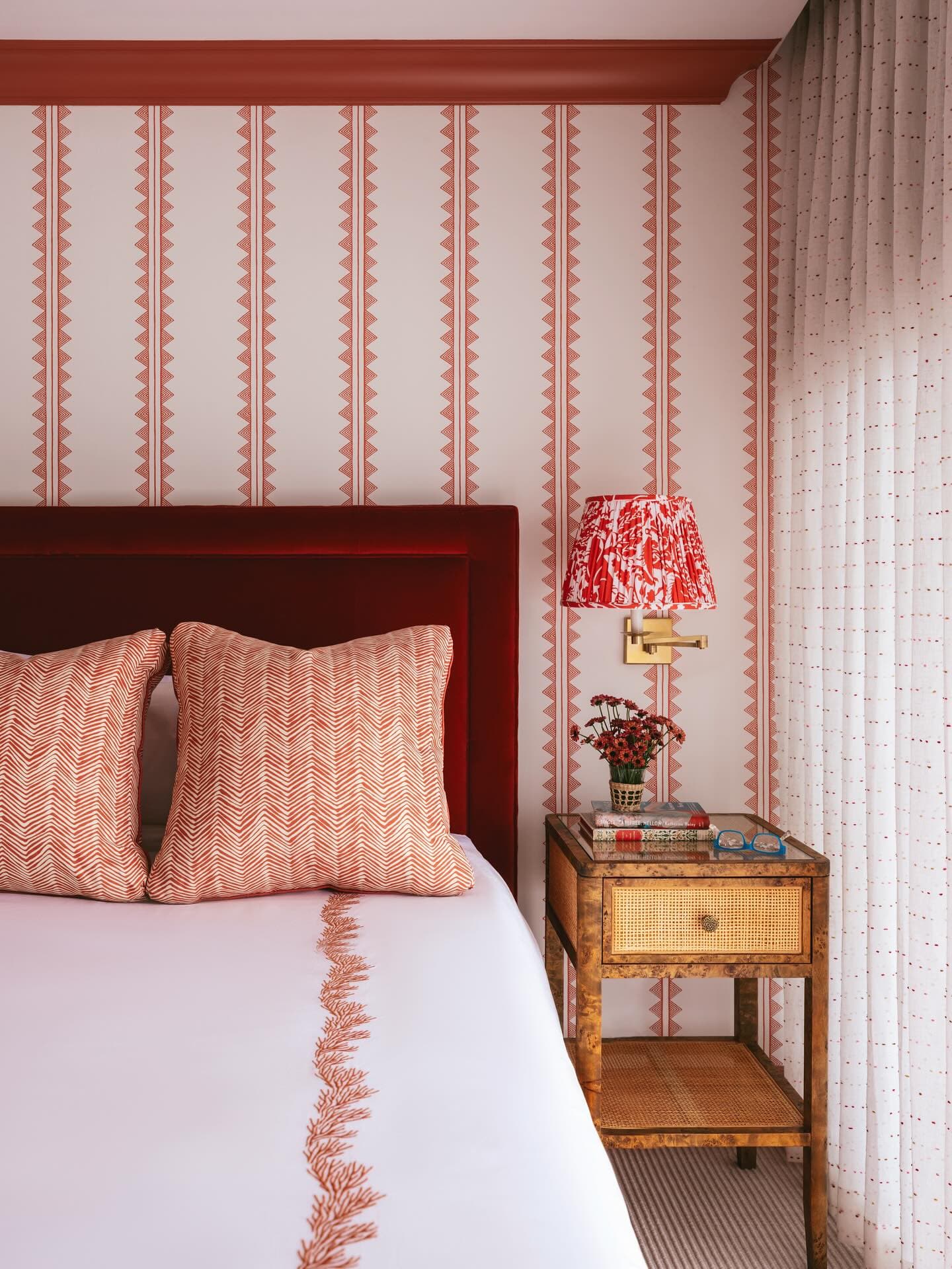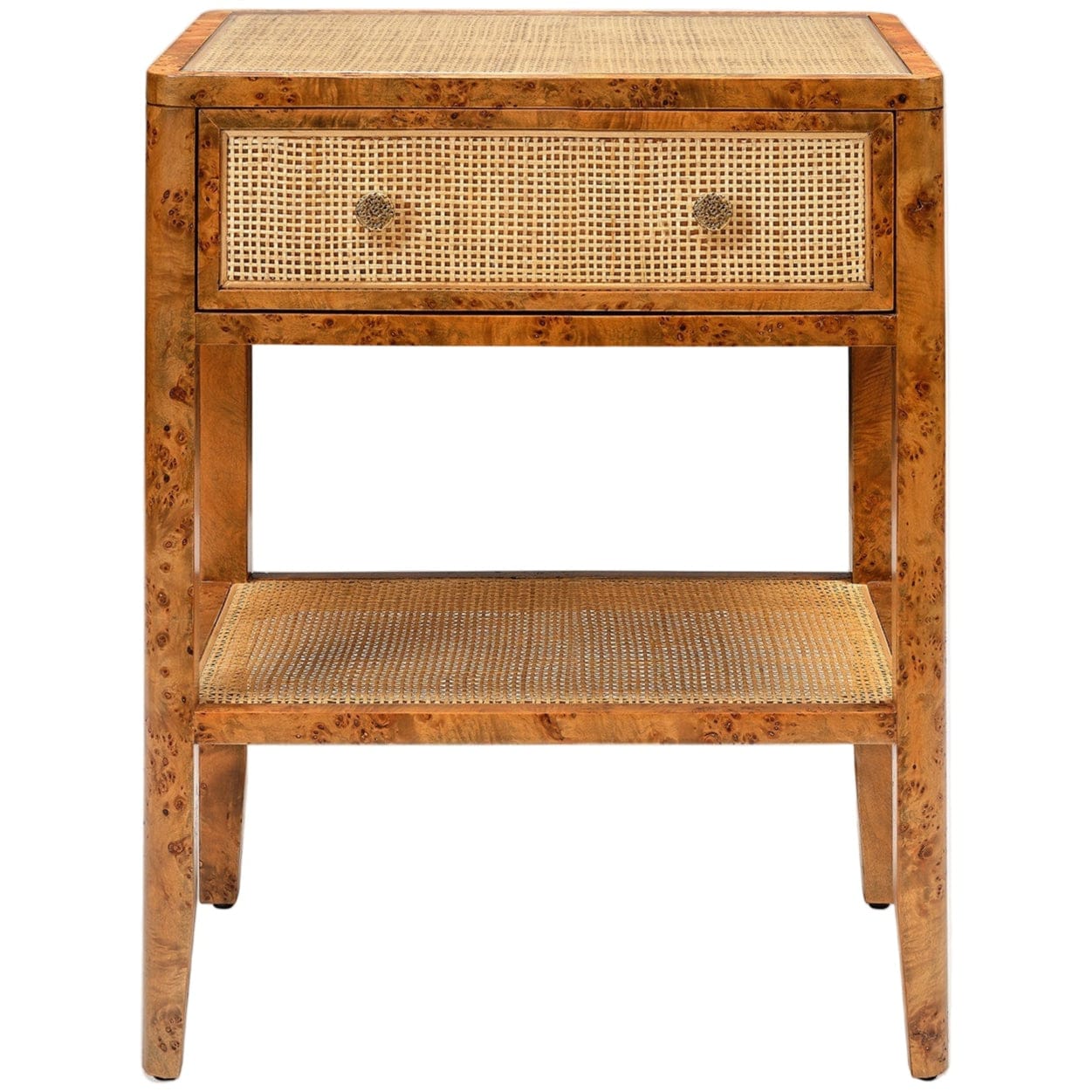 Standing atop tapered legs with elegant rounded corners, our Amara nightstand exudes a refined touch. Naturally occurring irregular grain patterns of poplar burl add character and its glass top reveals four caned panels.