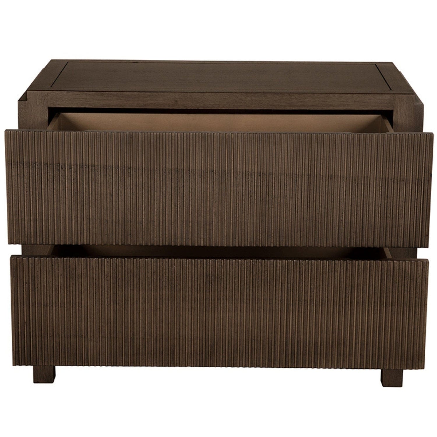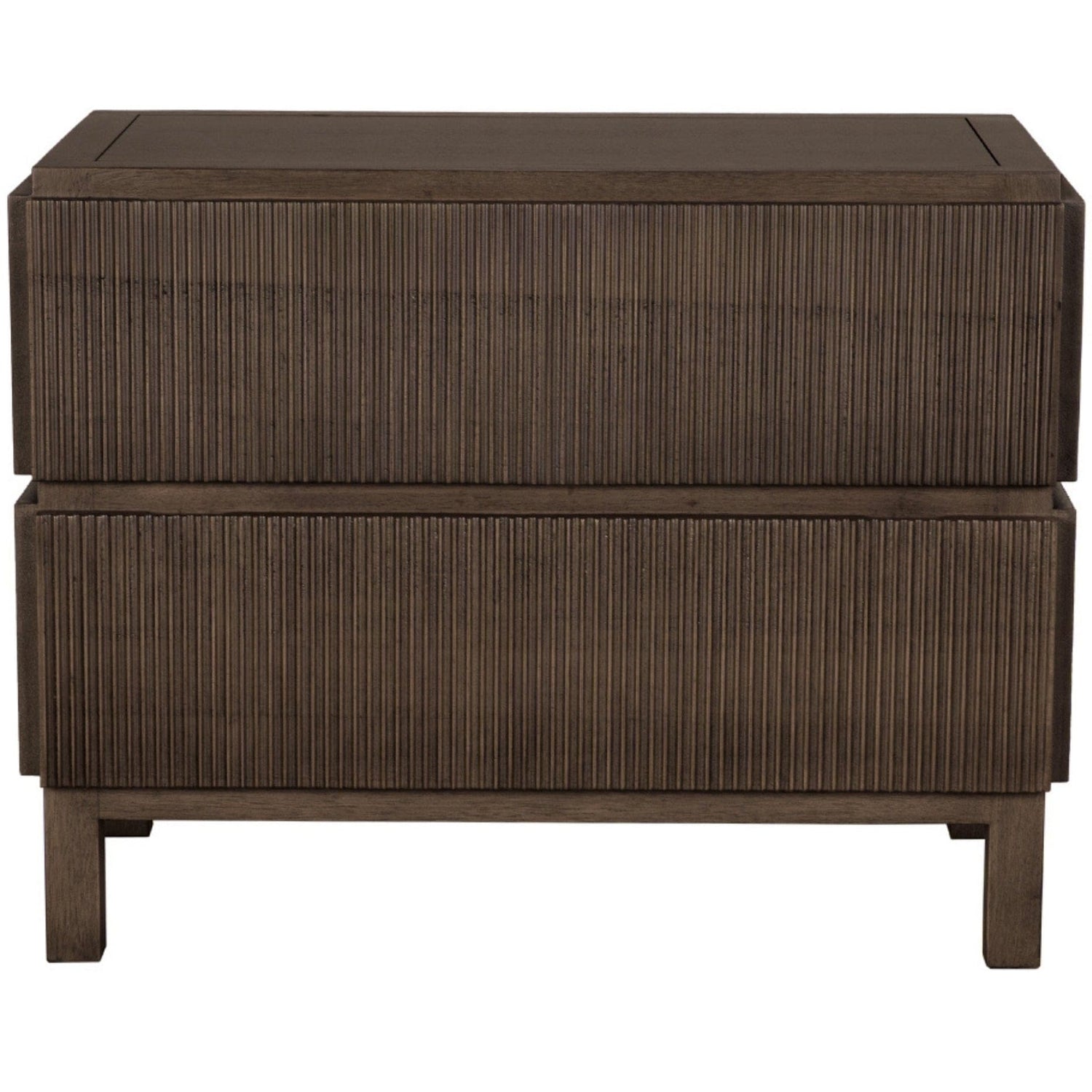 This two-drawer side table showcases vertical ribbed detailing in a deep black and greige walnut finish, elevated on minimal block legs merging modern texture with architectural simplicity for a bold, sculptural statement.